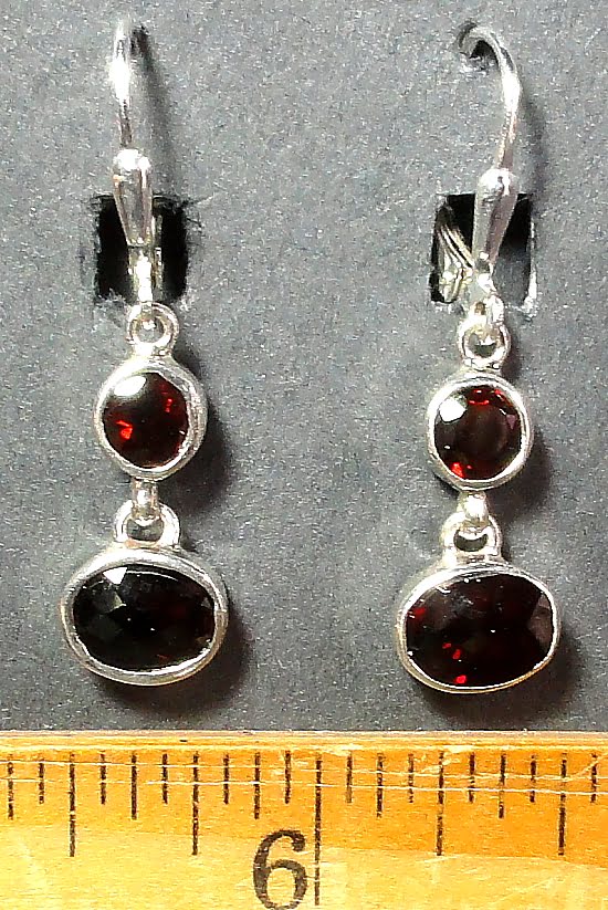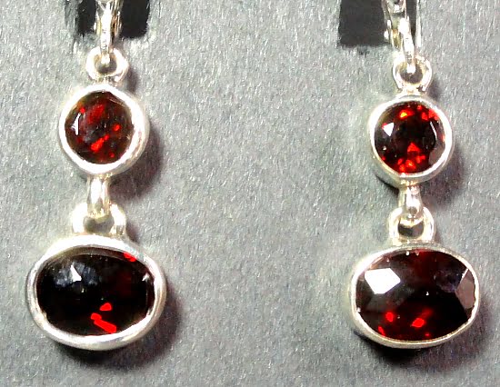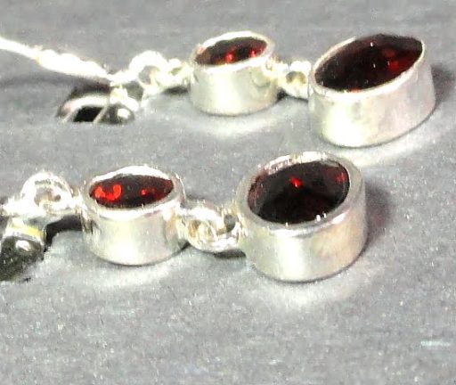 This is a very pretty set of Garnet earrings mounted in a Sterling Silver setting.  The faceted cabochons measure 7mm x 4mm with the smaller being 2mm.  The total length is 1 1/4″ with a clasp hook wire for pierced ears.  These are a dangle type earrings.