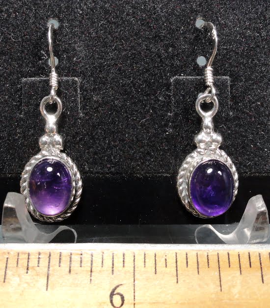 This is a very pretty set of Amethyst Earrings mounted in a Sterling Silver setting.  The Amethyst cabochons measure 6 mm x 8 mm.  The total length is approximately  1 1/4″ with a Silver plated French hook wire.  These are a dangle type earring.