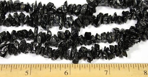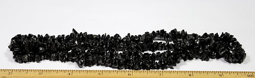 LN204 This is a pretty black Onyx chip bead necklace. These beads have a good polish and average 5 to 6 mm in size. This strand is 35″ long.