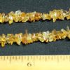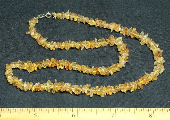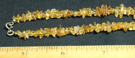SN100 This is a 17 1/2″ strand of Citrine chip beads. The bead size averages 5 to 6 mm and it has a sterling silver spring ring clasp. These are very pretty necklaces. It would make a great addition to any jewelry collection.