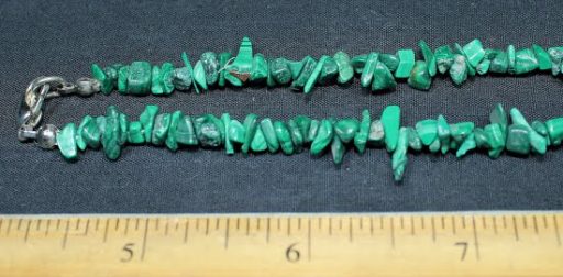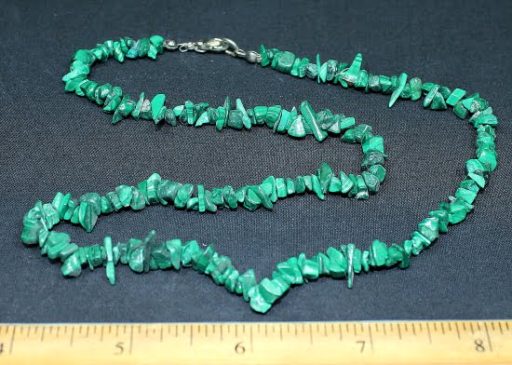 This is a 17″ strand of beautiful Malachite chip beads. The bead size averages 4 to 6 mm and it has a sterling silver clasp.