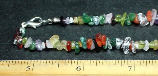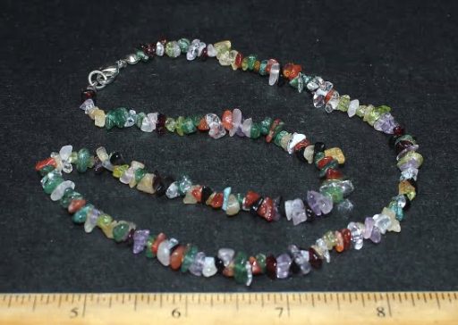 SN300 This is a 17 3/4″ strand of very colorful multi color chip beads. The bead size averages 4 to 6 mm and it has a sterling silver clasp. It would make a great addition to any jewelry collection.