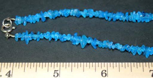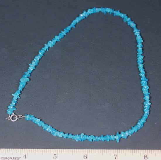 SN308 This is a pretty Neon Apatite chip bead necklace. The bead size averages 5 to 6 mm and it has a sterling silver clasp. It would make a great addition to any jewelry collection. This necklace strand measures 17 1/2″ in length.