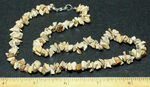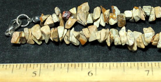 SN402 This is a 17 1/2″ length Picture Jasper chip bead necklace. The bead size averages 5 to 6 mm. The colors are various tones of brown. It has a sterling silver spring ring clasp.