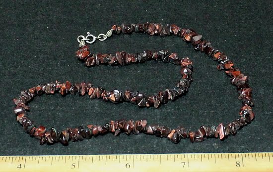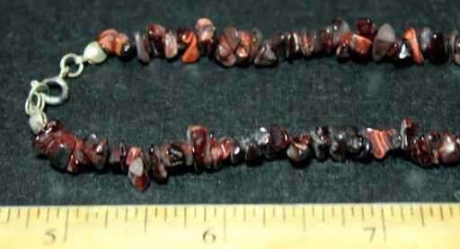 SN404 This is a 17 1/2″ strand of red Tiger Eye chip beads. The bead size averages 5 to 6 mm and it has a sterling silver clasp. Red Tiger Eye is the result of heat treating gold colored Tiger Eye.