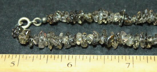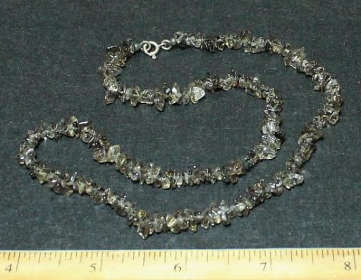 SN400 This is a 17 3/4″ strand of light to dark grey Smokey Quartz chip beads. The bead size averages 5 to 6 mm and it has a sterling silver clasp.