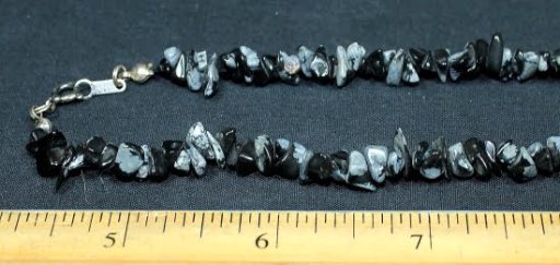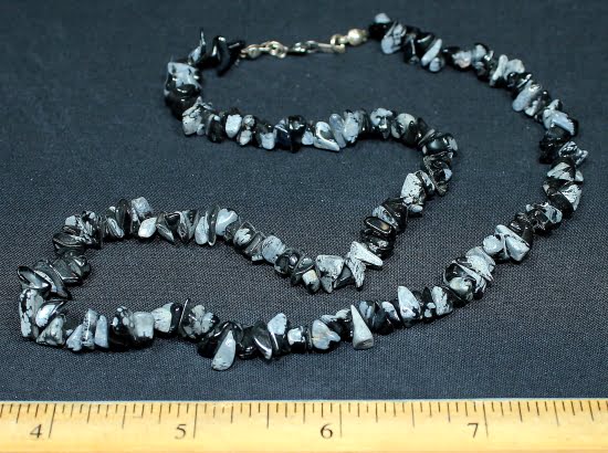 In some stones, the inclusion small, white, radially clustered crystals of cristobalite in the black glass produce a blotchy or snowflake pattern (snowflake obsidian).