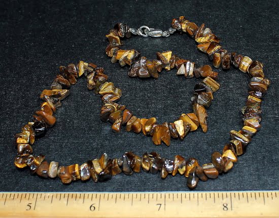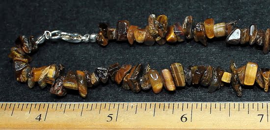 SN302 This is a 16″ Tiger-Eye chip bead necklace. The bead size averages 5 mm and are a very pretty gold and brown. It has a sterling silver spring ring clasp. Would make a great gift or to add to your own jewelry box.