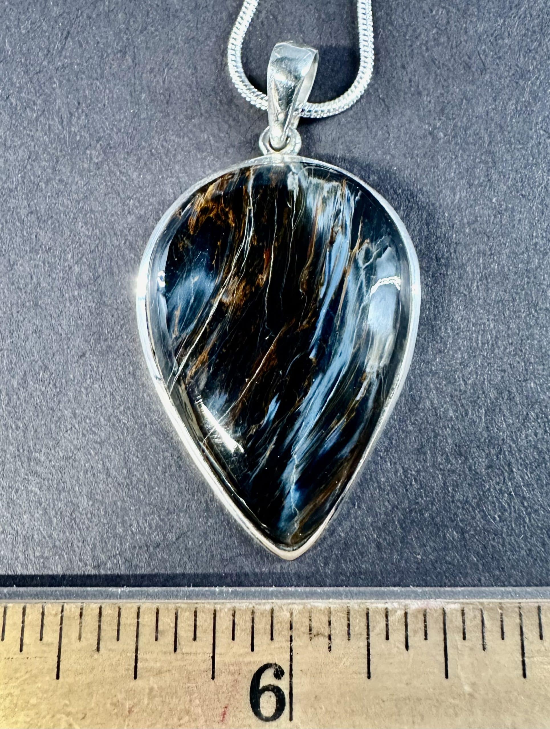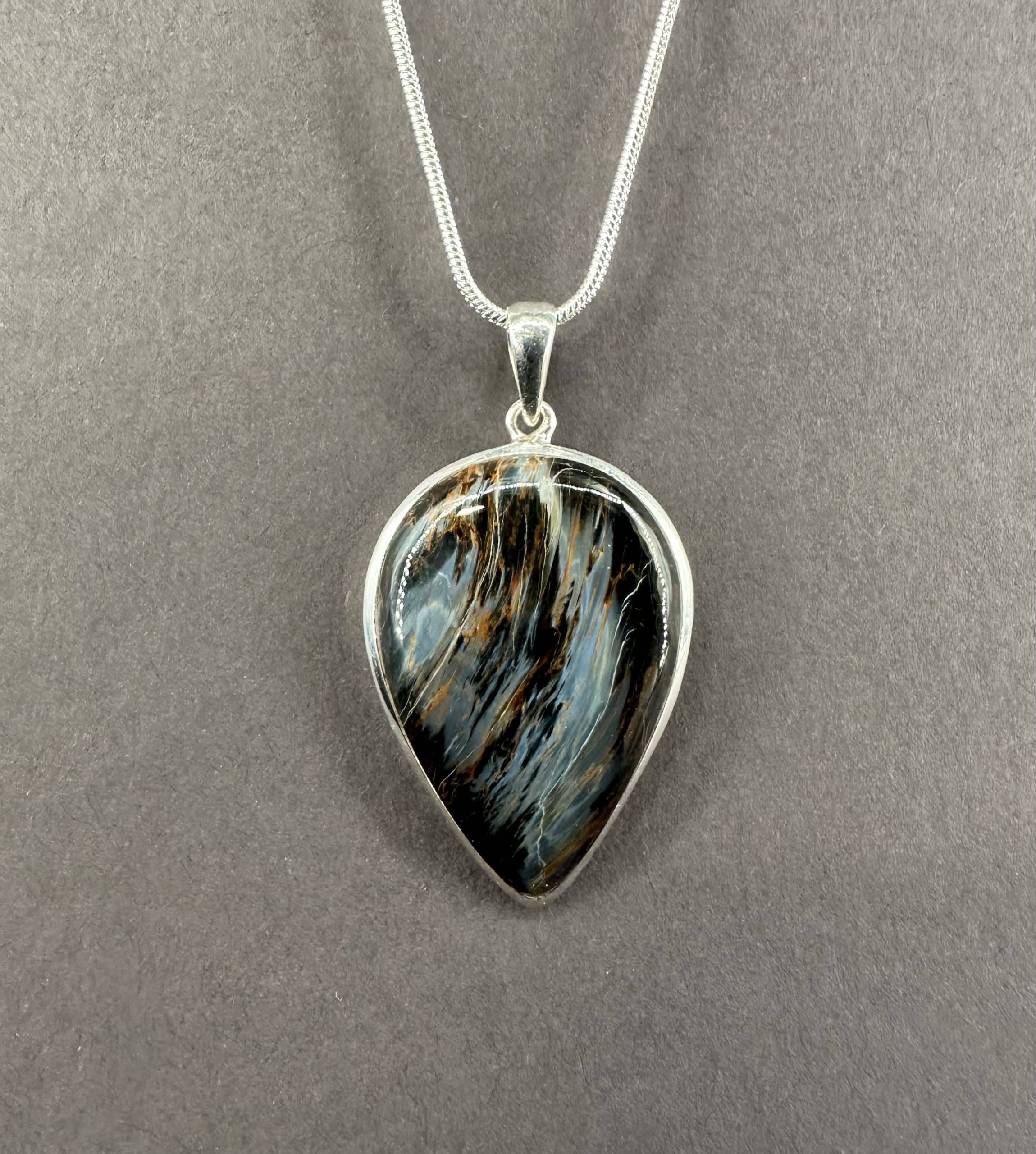 Pietersite was discovered by Sid Pieters in 1962 while prospecting farmland in Namibia, Africa and was named after him in 1964. Currently there are only two known sources of Pietersite: Africa and China. Pietersite is considered a type of Tiger Eye, having the same properties but with different patterns due to its brecciated formation. While Pietersite has the lovely chatoyancy of Tiger Eye, it is not found in continuously structured bands but rather in swirls, swathes and fibrous (sometimes linear) segments. They appear chaotic and can exist in many directions like bold paint strokes. African Pietersite is the most sought after due to its wide range of color which include various blues, golds, and reds with blue being the rarest followed by red.