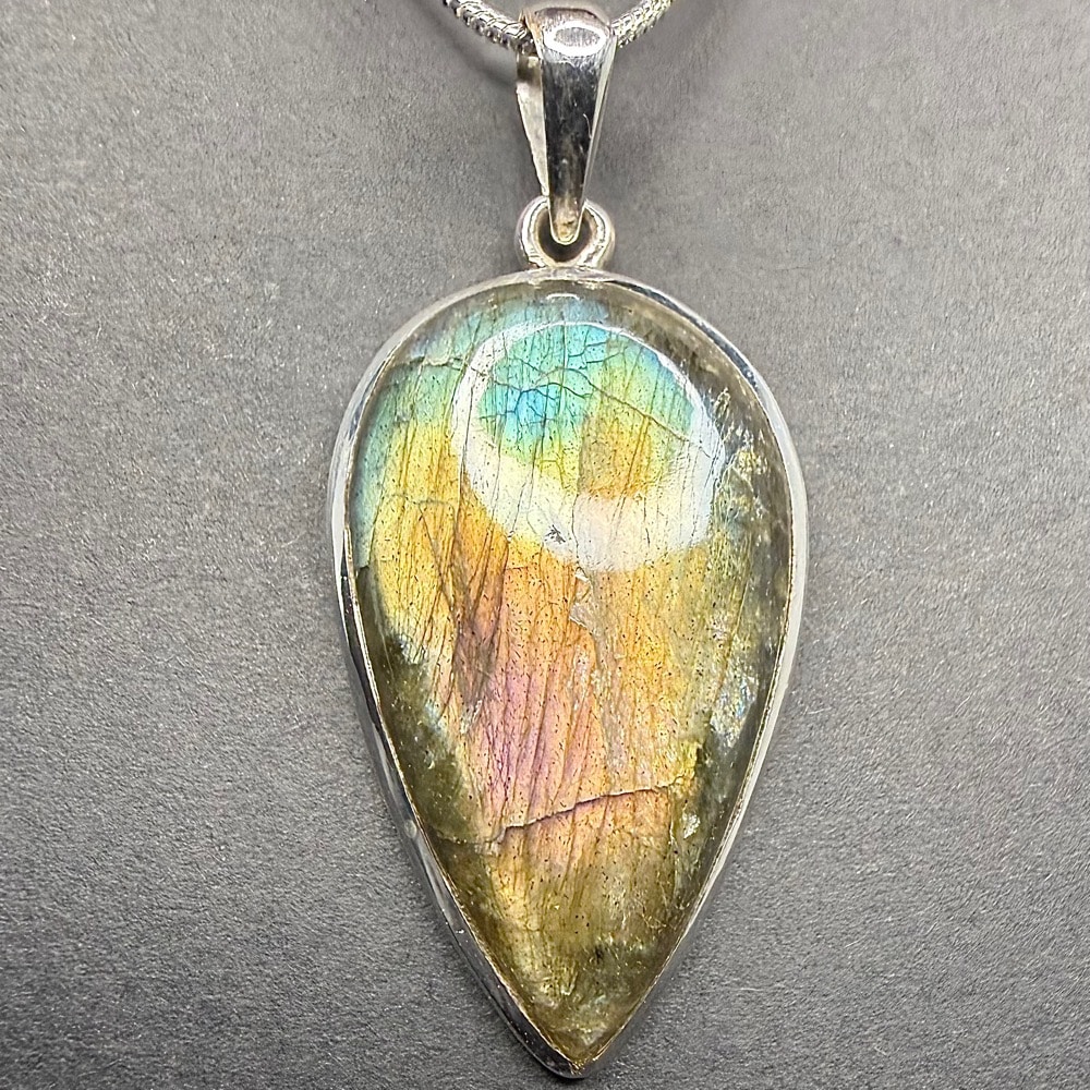 Labradorite is a Feldspar mineral that occurs in large Crystal masses in anorthosite and shows an iridescence or “play of colors.” Gemstone varieties of Labradorite exhibiting a high degree of iridescence are Spectrolite, Moonstone and Sunstone. High quality samples with good iridescent qualities are desired for jewelry.