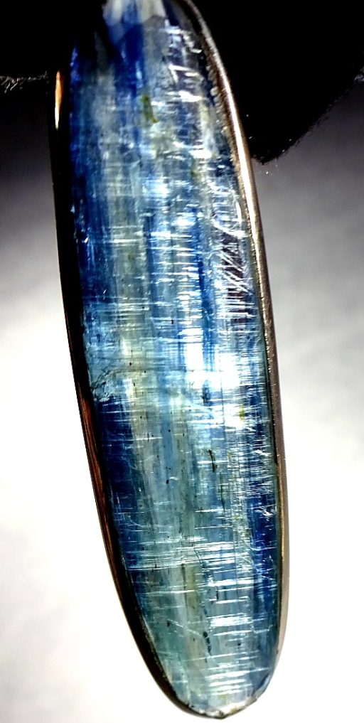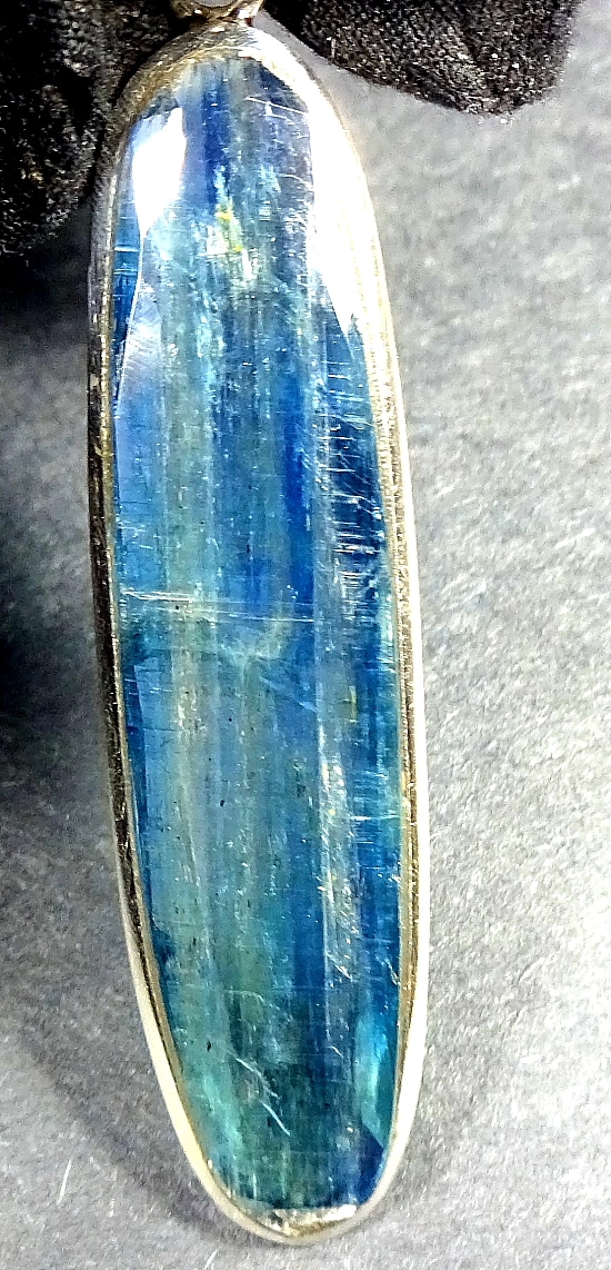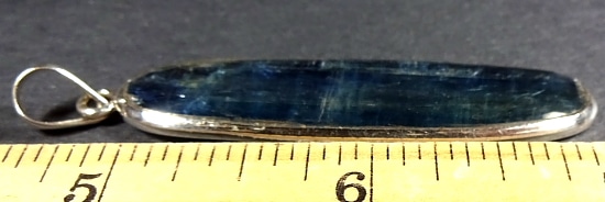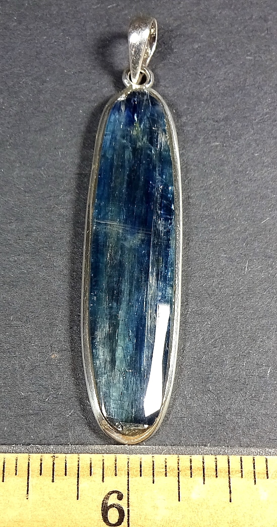 Here is a very nice, above average quality Kyanite sterling Silver pendant.  The cabochon measures 10mm x 50mm . The pendant measures 2 3/8″ from the top of the bail to the bottom of the setting. The bail size is 1/4″. Very nice!