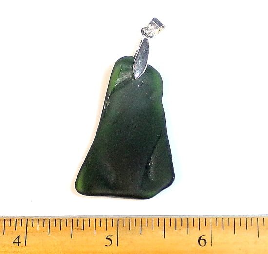 This unique pendant is a tumbled Glass stone with a silver colored bail. The stone measures 25mm in length by 70mm in height, the top of the bail to the bottom of the setting measures nearly 2 1/4″ from the top of the bail to the bottom of the setting. The bail size is 1/4″. This piece was made here at The Rock Shed.