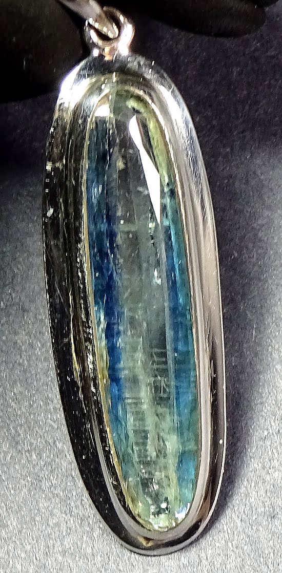 Here is an awesome new item, an  exceptional Kyanite pendant resting in a very nice sterling Silver setting.  The cabochon measures 7mm x 35mm.  This pendant measures 1 7/8″ from the top of the bail to the bottom of the setting.  The bail size is 1/4″.
