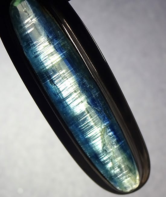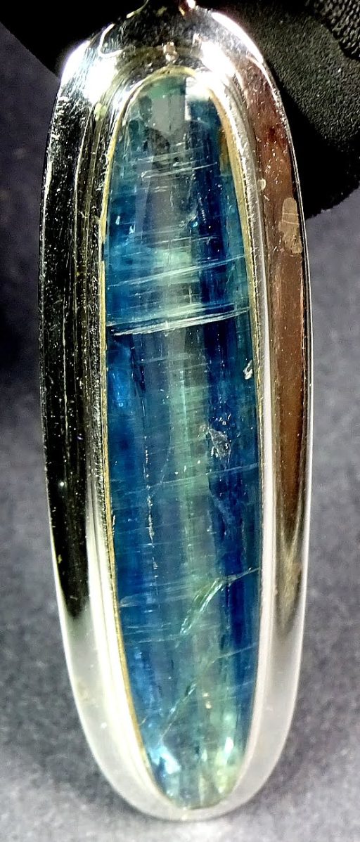 Here is an awesome new item, an  exceptional Kyanite pendant resting in a very nice sterling Silver setting.  The cabochon measures 10mm x 48mm.  This pendant measures 2 1/2″ from the top of the bail to the bottom of the setting.  The bail size is 1/4″.