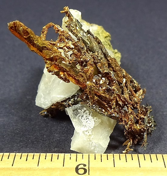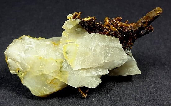 Copper does not react with water, but it does slowly react with atmospheric oxygen to form a layer of brown-black copper oxide which, unlike the rust that forms on iron in moist air, protects the underlying metal from further corrosion (passivation). A green layer of verdigris (copper carbonate) can often be seen on old copper structures, such as the roofing of many older buildings and the Statue of Liberty. Copper tarnishes when exposed to some sulfur compounds, with which it reacts to form various copper sulfides.