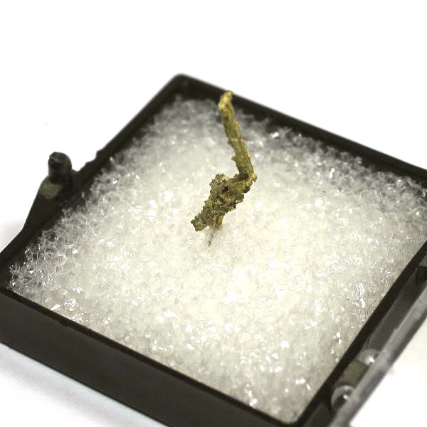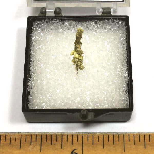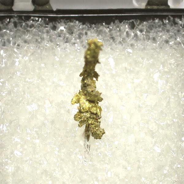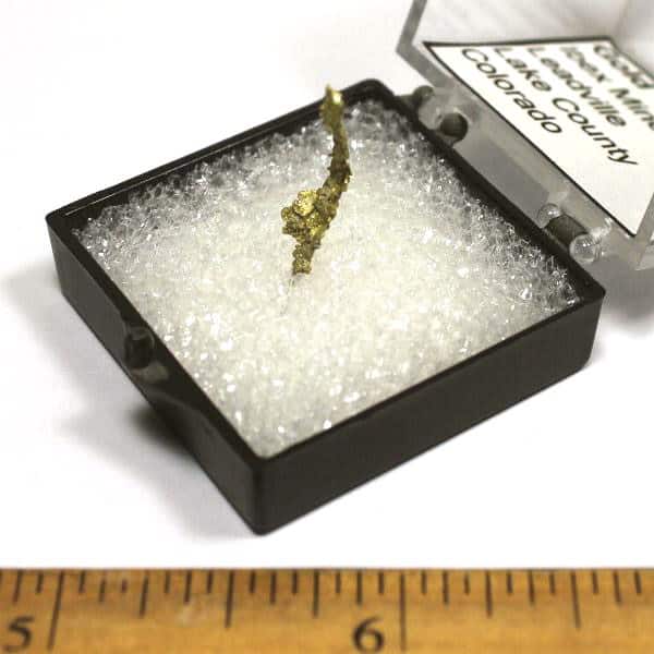 This is a nice Gold Crystal from the Ibex Mine in Leadville from Lake County, Colorado. This very cool Gold specimen measures approximately 1/2″ x 1/16″ x 1/16″. It is mounted in a 1 1/4″ square plastic box on a removable plastic base.