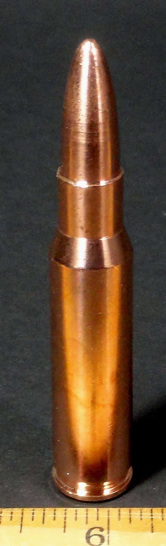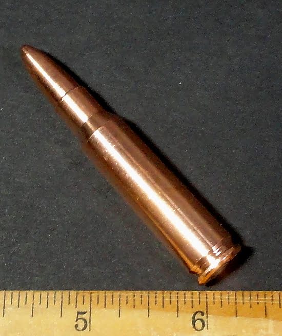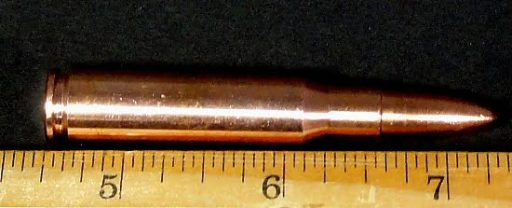 Here is a nice Solid Copper Bullet made from .999 Copper. This “bullet” is in the shape of a .223 round as used in a AR-15 or M-16. This is not a real bullet and cannot be fired. This “bullet” is 2 3/4″ long x almost 1/4″ in diameter and has a nice Copper color. This solid Copper “bullet” makes a great investment or an excellent gift.