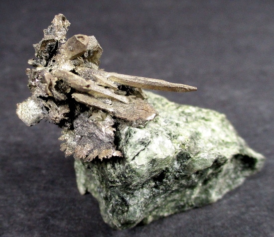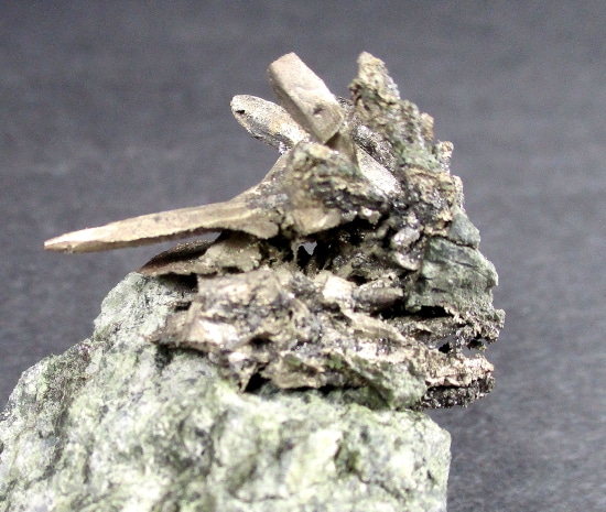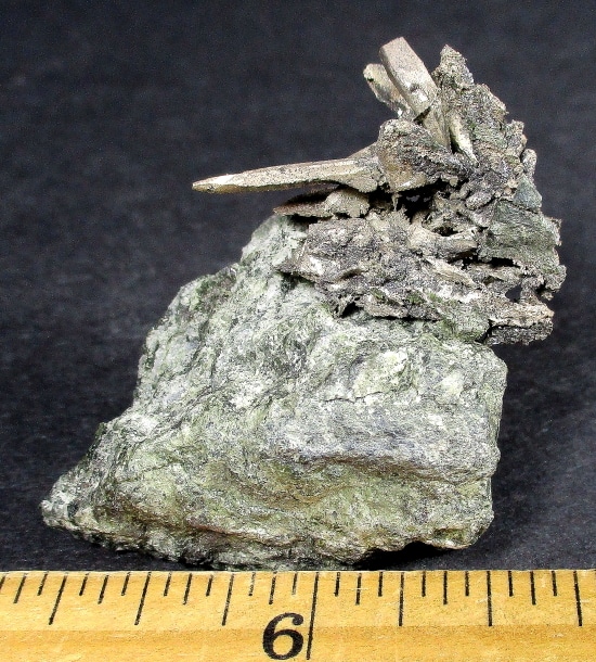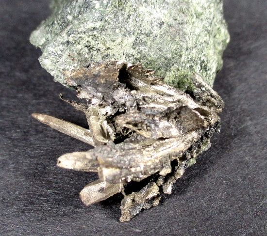 Here’s an exceptional specimen of Silver in matrix from the Bousimas Mine Bou-Azzer, Morocco. It measures 2 5/8″ x 1 1/4″ x 1 1/8″. Nice natural Silver specimens are harder to find and generally not available. The Silver is quite delicate, and although we use extreme care in packing you may find some pieces flaked off. This is a great collector’s item. Exceptionally nice!