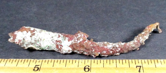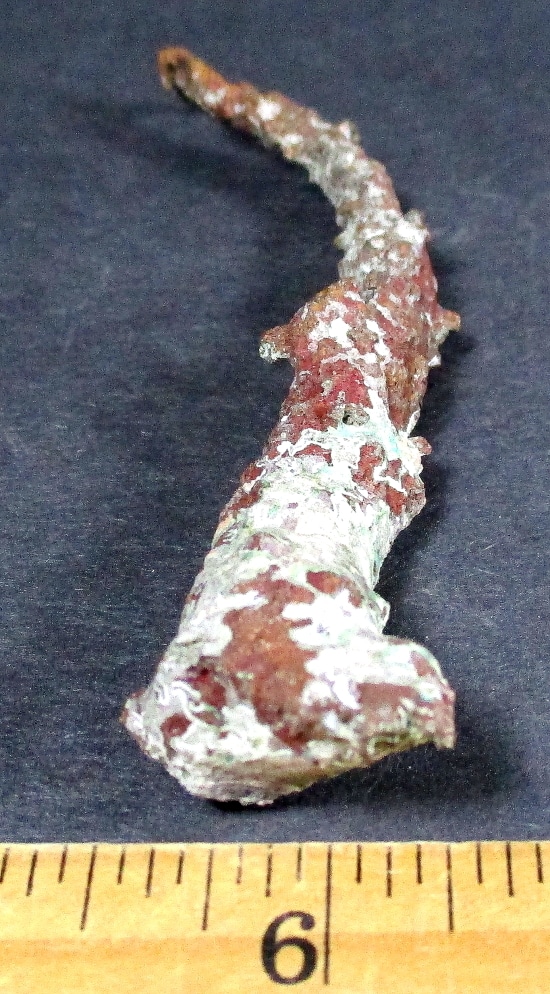 Mohawkite is a rare rock consisting of mixtures of arsenic and copper, usually in a white quartz matrix. Colors range from brassy-yellow to metallic gray, and sometimes will have a blue or greenish surface tarnish. These colors come from its two main ingredients, the arsenic-rich copper minerals algodonite and domeykite. Its color may resemble pyrrhotite, but unlike pyrrhotite, mohawkite is not magnetic. Mohawkite is believed to only be found in a copper mine located on the Keweenaw Peninsula of Michigan, known as the Mohawk Mine.