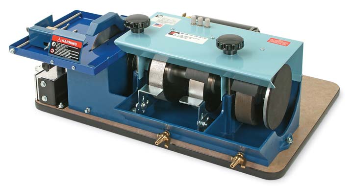 830012 This 6″ combination lapidary polisher/trim saw/grinder has three stainless steel valves that provide independent water flow to both grinding wheels and the expandable drum. A submersible water pump provides cooling water recirculation. The one-piece cast aluminum tank and base has sealed bearings mounted to a 5/8″ stainless steel shaft. The end-polishing disc is ideal for final polish and buff. The trim saw has a removable table top and tank drain plug for ease of oil/sludge removal. Shown with trim saw rock vice which is sold separately.