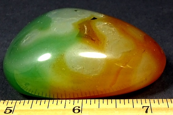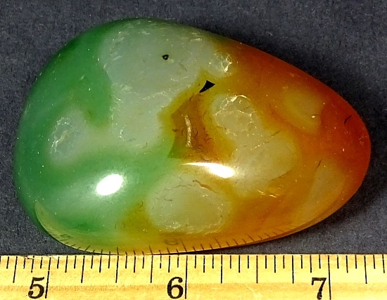 Here is a beautiful Agate that has been heat treated. This highly polished specimen measures 2 1/2″  x  1 7/8″ x 1 1/8″. It has wonderful banding, neat accents and pretty colors that have been brought to life from the heat treatment. Take note of the last photo; it looks like a candy corn. Something very nice for that someone special.