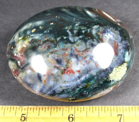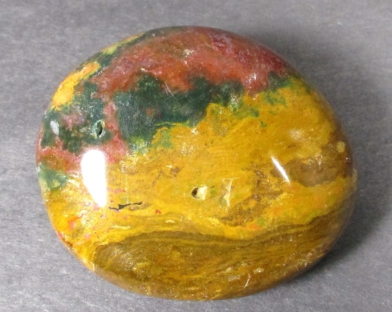 Jasper, or spotted stone, is an opaque, impure variety of Quartz that is usually red, yellow or brown in color.  Some Jaspers simultaneously exhibit several variants such as banding, flow patterns, dendrites or color variations.  This results in what appears to be scenes or images in a cut section of the Jasper.