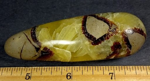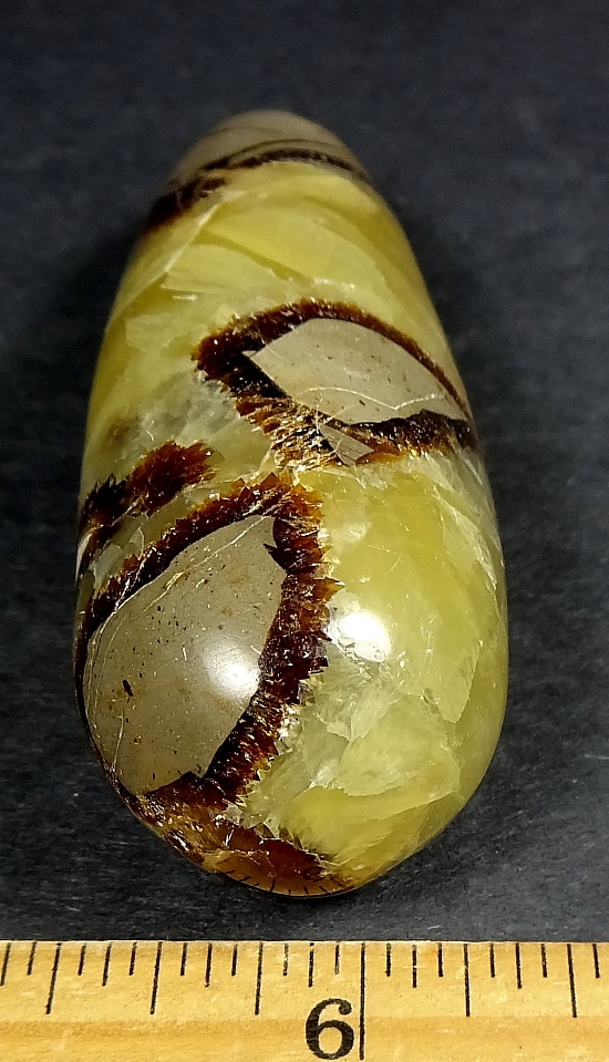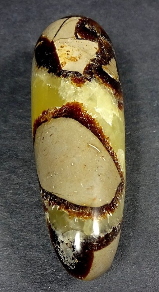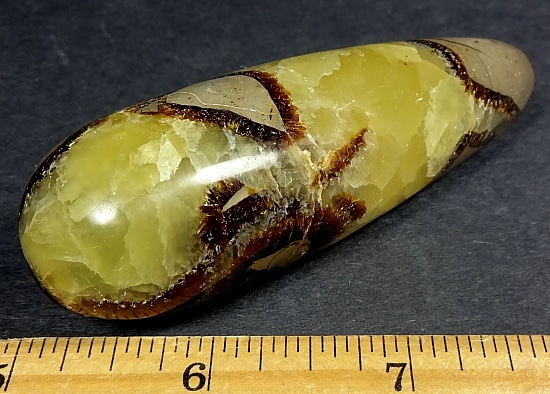 This is a beautiful polished Septarian Massage Wand from Utah.  It has fantastic Yellow Calcite contrasting the Brown Aragonite in a nice design.  It measures 3 3/8″ long x 1 1/8″ in diameter on the thicker end and is highly polished on all sides.  An excellent massage wand or conversation piece for your collection!