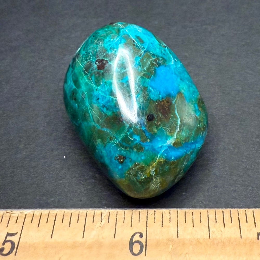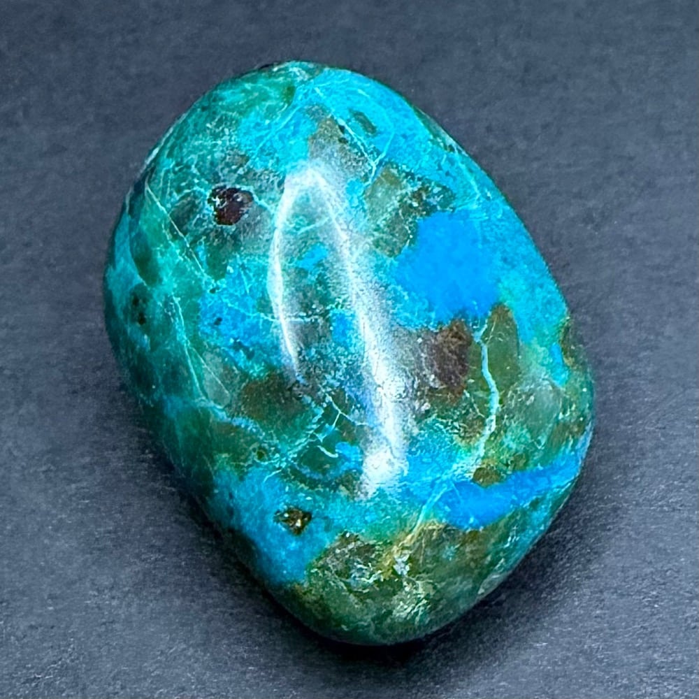 Chrysocolla is of secondary origin and forms in the oxidation zones of copper ore.  Some associated minerals are Quartz, Limonite, Azurite, and Malachite and Chrysocolla is often confused with Turquoise as they are similar in color.  It gets its name from Greek chrysos “gold” and kolla “glue”.  It is known among Native American cultures as a healing stone and said to promote calm and level headedness.