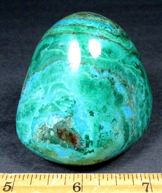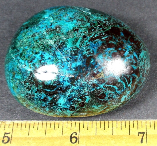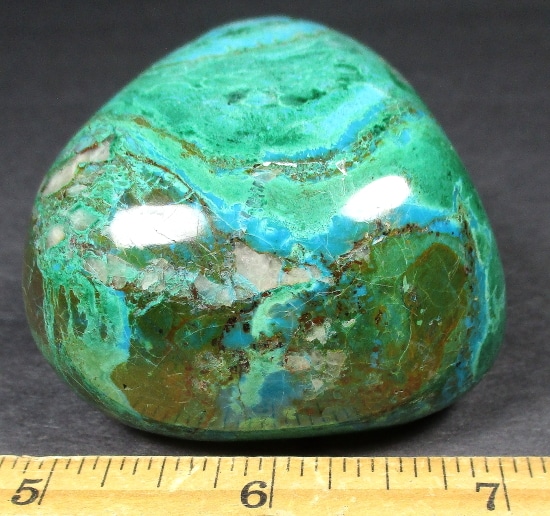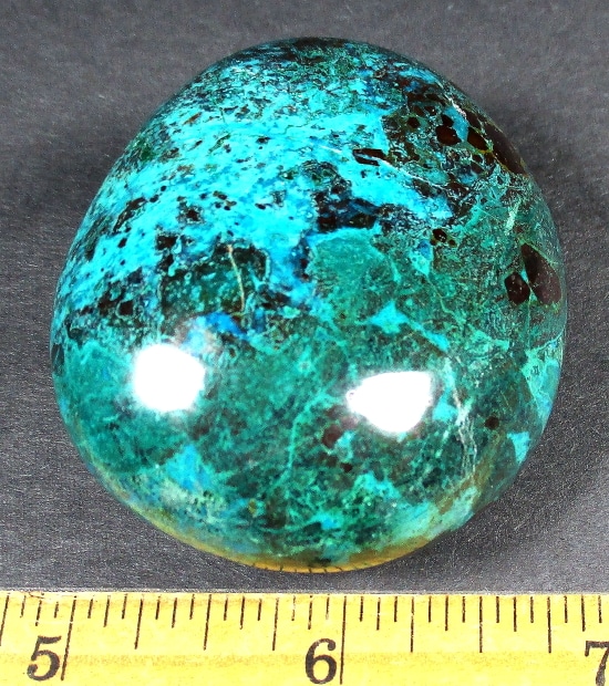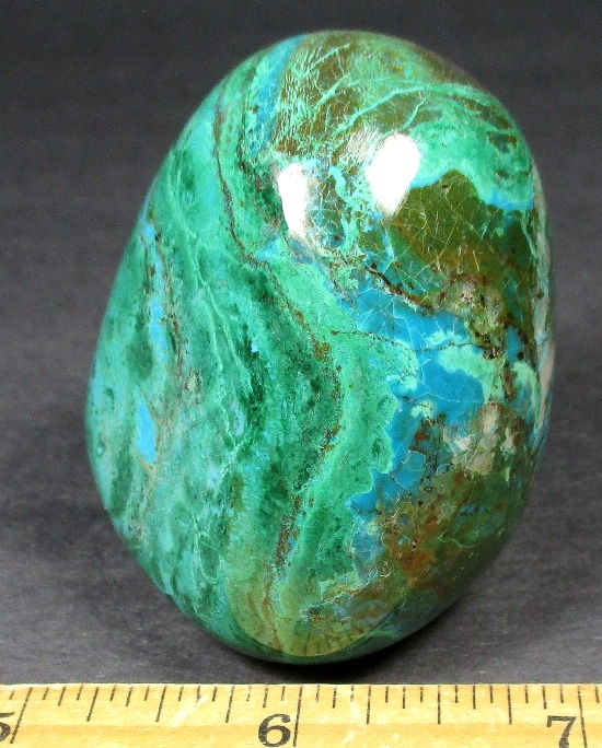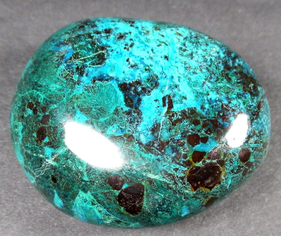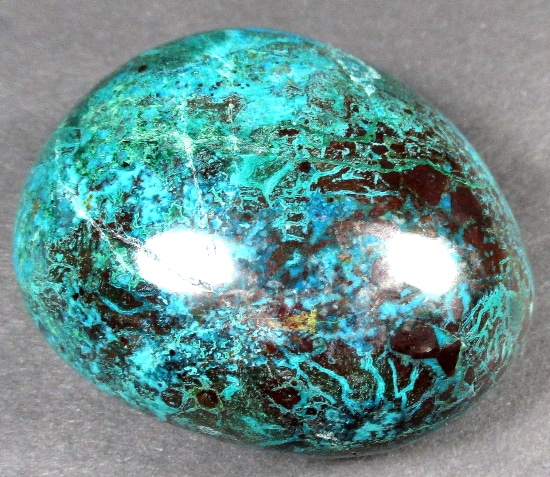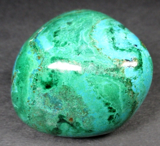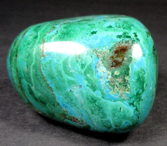 Chrysocolla is of secondary origin and forms in the oxidation zones of copper ore. Some associated minerals are Quartz, Limonite, Azurite, and Malachite and Chrysocolla is often confused with Turquoise as they are similar in color. It gets its name from Greek chrysos “gold” and kolla “glue”. It is known among Native American cultures as a healing stone and said to promote calm and level headedness.