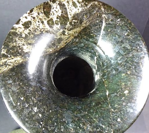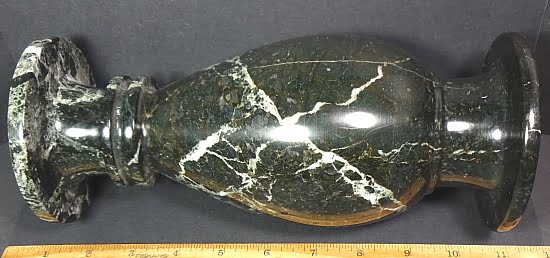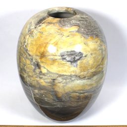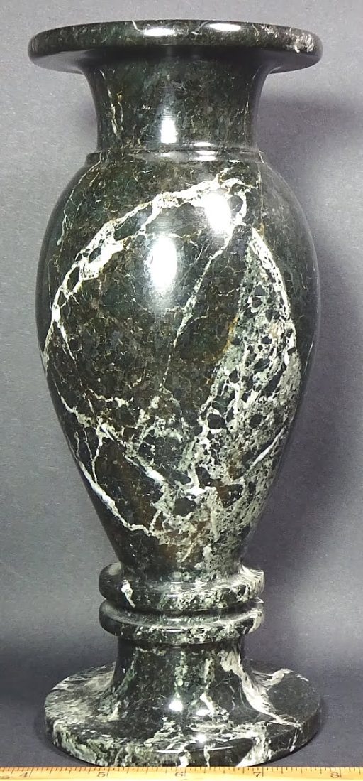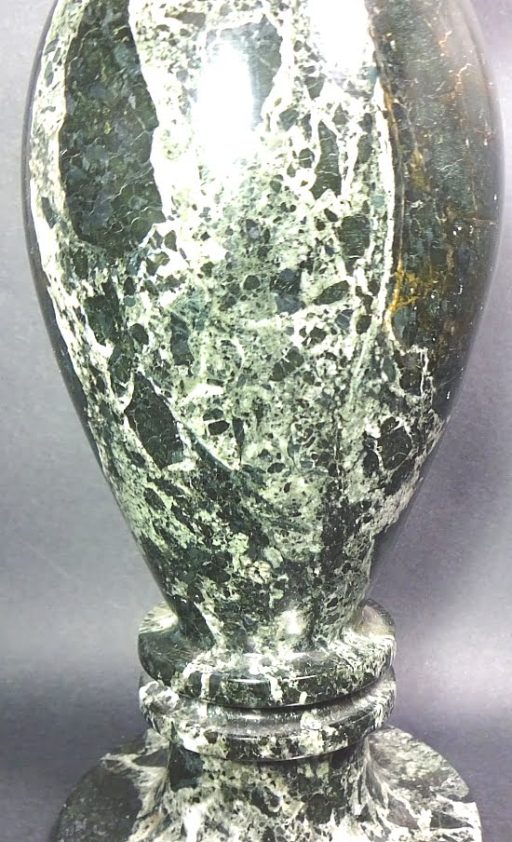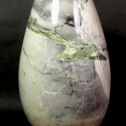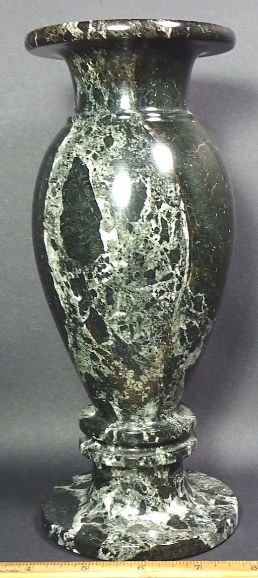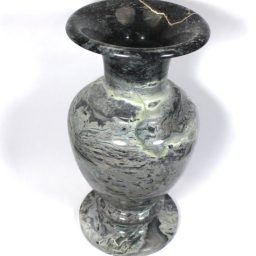 Here is a beautiful vase carved from Zebra Marble from Pakistan. This highly polished rock vase has a good color mix of Black and Greys with lighter accents of White in a nice design.  It measures 9 3/4″ tall x 4 1/8″ in diameter.  Definitely a one-of-a-kind treasure or makes a great gift!