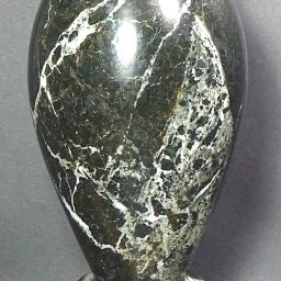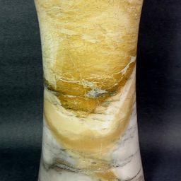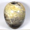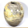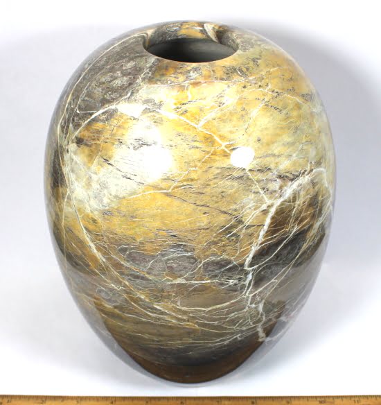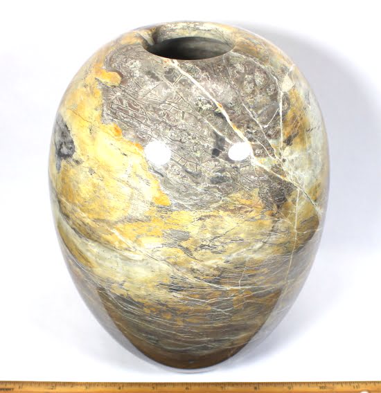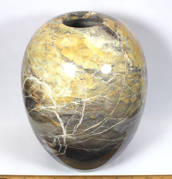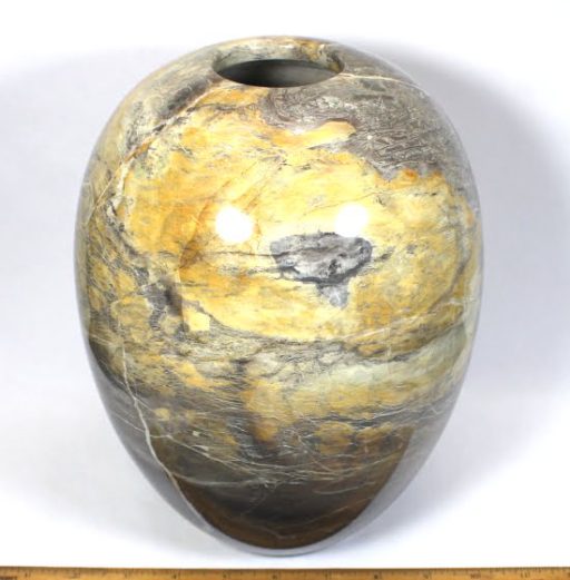 Here is a beautiful vase carved from Peacock Marble from China. This highly polished rock vase has a good color mix of Yellows, Greys and Creams with accents of Brown and Greens in a nice design.  It measures nearly 9 3/4″ tall x approximately 7″ in diameter and weighs over 6 3/4 pounds .  Definitely a one-of-a-kind treasure or makes a great gift!