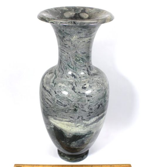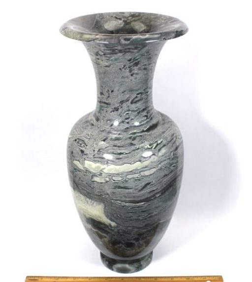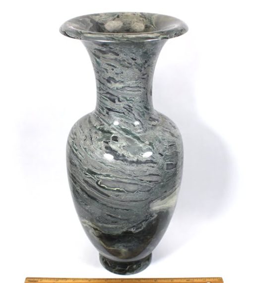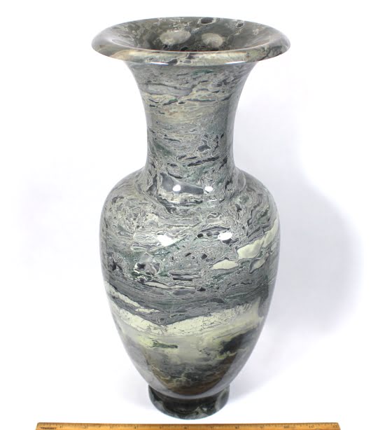 Here is a beautiful vase carved from Peacock Marble from China. This highly polished rock vase has a good color mix of Greys, Greens  and accents of Brown and Creams in a nice design.  It measures approximately 15″ tall x 6 1/4″ in diameter and weighs nearly 15 1/2 pounds.  Definitely a one-of-a-kind treasure or makes a great gift!