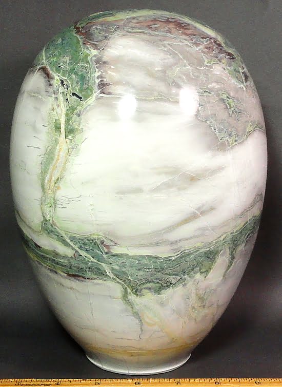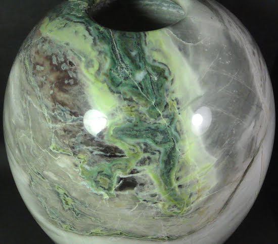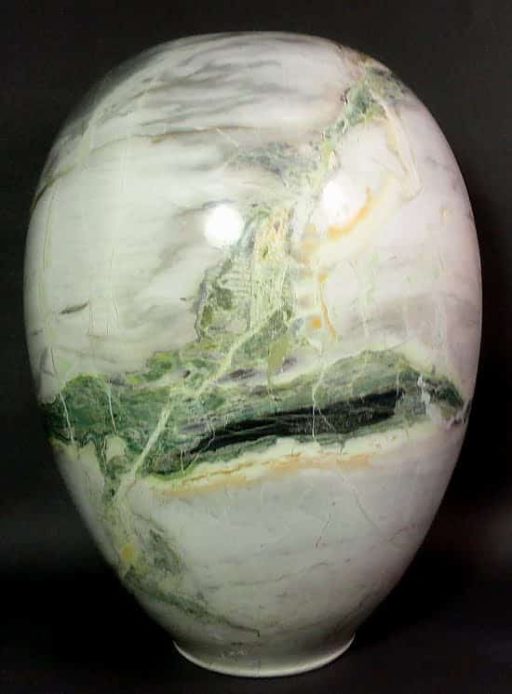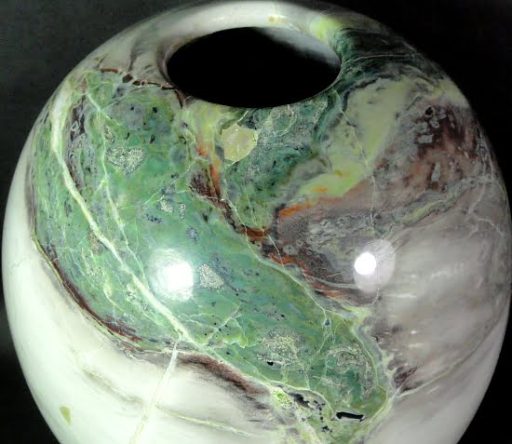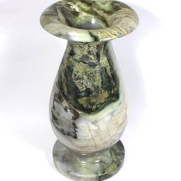 Here is a large beautiful vase carved from Peacock Marble from China. This highly polished rock vase has a good color mix of lighter Greys, Greens, White with other accents  in a nice design.  It measures 9 7/8″ tall x approximately 7 1/4″ in diameter and weighs almost 7 1/2 pounds.  Definitely a one-of-a-kind treasure or makes a great gift!