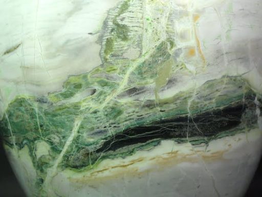 Peacock Marble is from Southwest China and formed in Limestone by heat and pressure in the earth’s crust. Recrystallization during Himalaya formation caused the limestone to change in texture and makeup. Fossilized materials along with it’s original carbonate minerals, recrystallized and formed large, coarse grains of calcite. Impurities present in the limestone during the recrystallization affected the mineral composition of the marble.  The minerals that result from the impurities give the marble up to ten different colors. The corresponding colors and minerals that can be found: Green – Serpentine; Purple – Manganese spar; Brown – Iron; Gray – Silicon Dioxide; Red – Hematite; Orange – Iron; White – Calcite; Violet – Iron Manganese; Yellow – Limonite; Blue – Copper, Cobalt, Chromium; Black – Carbon, Iron, Manganese. Peacock Marble is also called “seven color Jade” in local language.