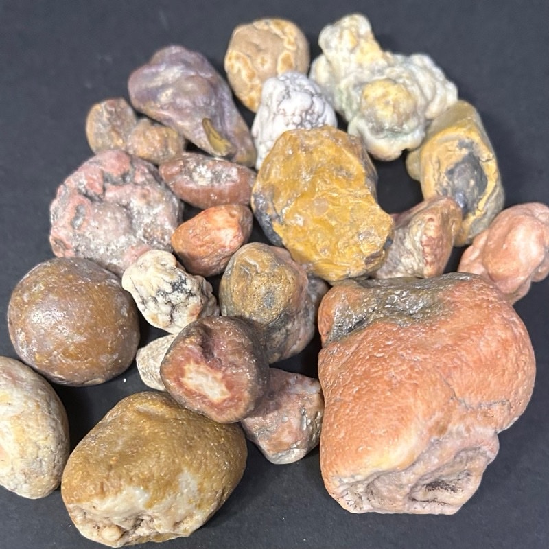 Bubblegum Agates are round bumpy jasper nodules, often times made up of two colors, making them appear like spent chewing gum.