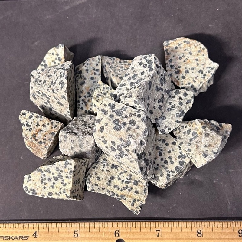 Dalmatian stone, also known as Dalmatian jasper, is a white to cream-colored rock with black spots, resembling a Dalmatian dog’s coat. It’s actually an igneous rock, a mixture of minerals like Albite, Quartz, and Arfvedsonite, rather than a true jasper. It’s often used in jewelry, decorative items, and crystal healing due to its unique appearance and perceived metaphysical properties.