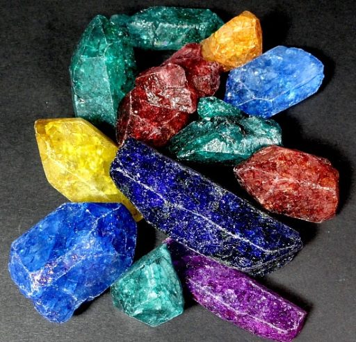 Here is a new and different item here at the Rock Shed. This is Dyed Crackle Quartz crystals that range in sizes from 1″ to 3″ or so. This rock is great for the rock tumbler, use for jewelry or as is for fountains or other decorative uses. There is a variety of pretty colors of blue, teal pink, red, purple and yellow. Take note of the last photo how great they look when tumbled!