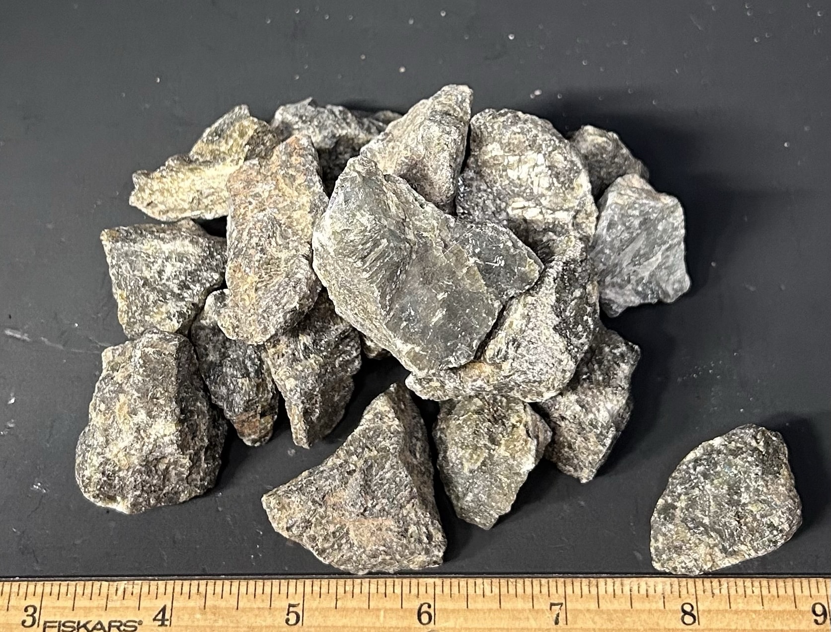 Crushed B grade Labradorite from Madagascar ranging in size from 3/4″ to 1 1/2″. This material has some color flash when rotated in bright light, but it is more speckled through the material than full sides of colorful flash.