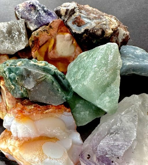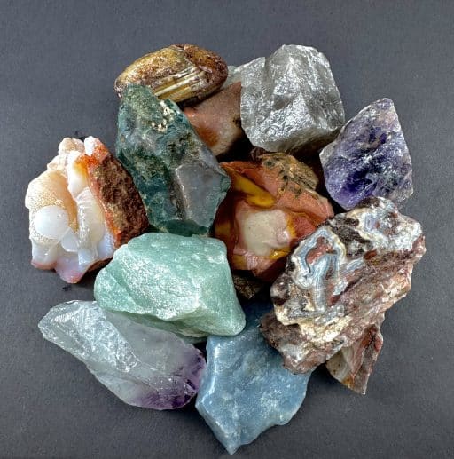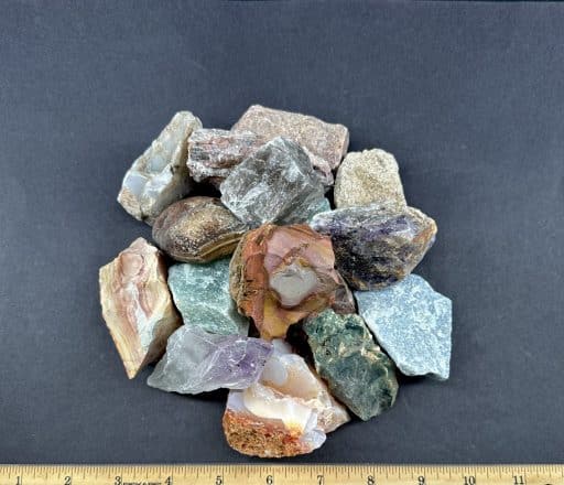 This is a mixture of different stones for the rock tumbler or other decorative use. This mixture consists of Rose Quartz, Green Aventurine, Lace Agate, White Quartz, different types of Jasper, Pudding Stone, Moss Agate, Sodalite, India Tree Agate, Petrified Wood, Turritella Agate, Prairie Agate and others. This material comes in sizes from 1 1/4″ to 2 1/2″. This material is too large to run alone in small tumblers and will need to be mixed with smaller material.