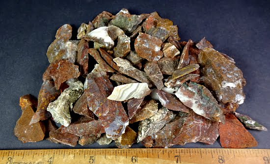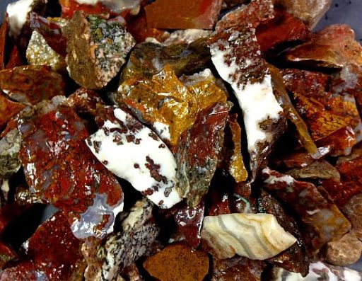Fall clean up here at The Rock Shed and we found some crushed Small Mexican Moss Agates from Mexico! The pieces range in size from 3/8″ to 3/4″ and we are selling the last of this material in 5lb bags only.