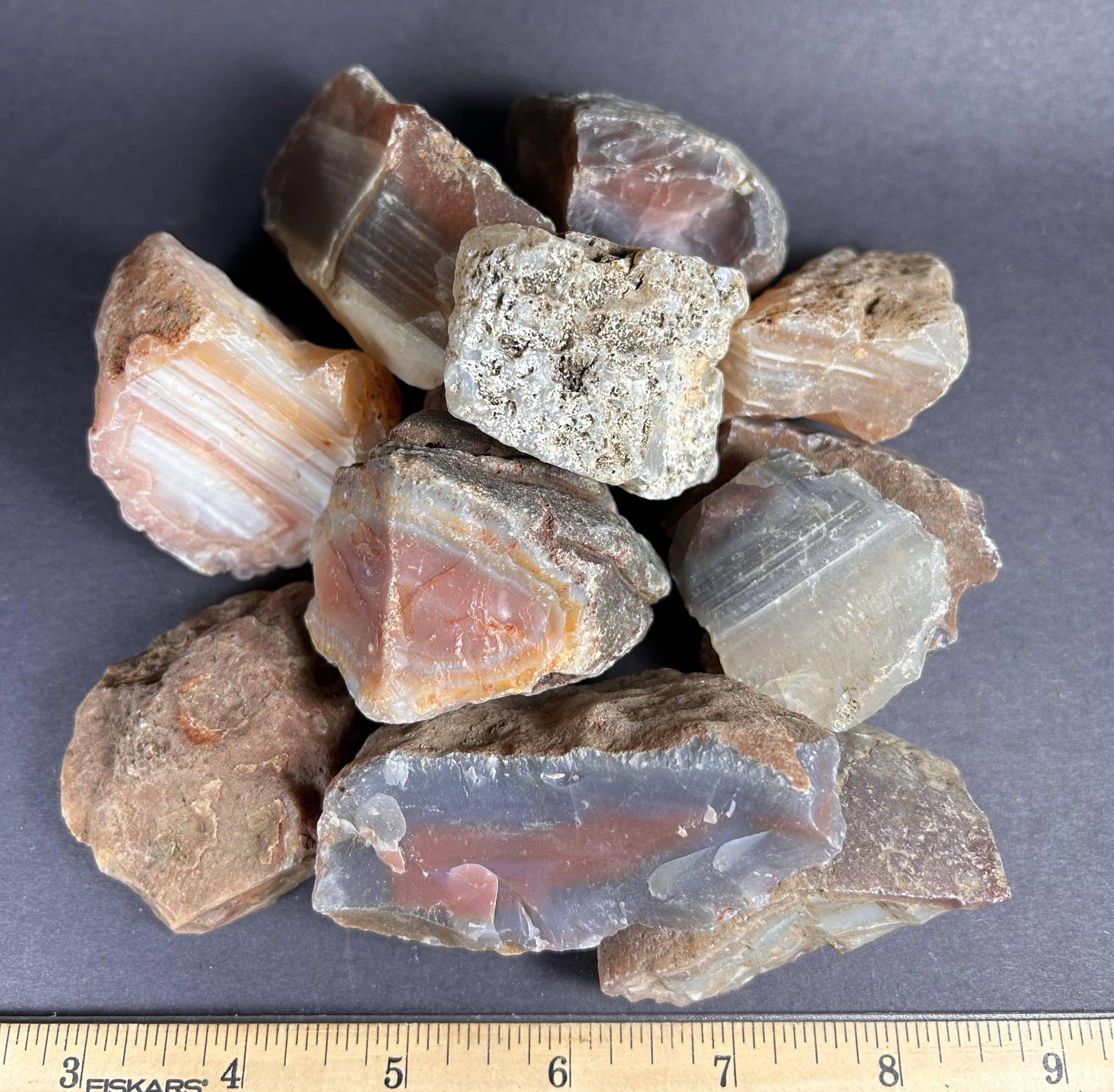 A very beautiful batch of crushed large sized Mozambique Agate, also known as Swazi Agates, from southeastern Africa. The pieces range in size from 1 1/2″ to 3 1/2″+ and each has a very unique design and color. This material has a superb range of mixed red, blue and orange colors with some pieces having water level lighter banding for a nice appearance and variety.