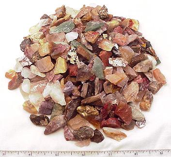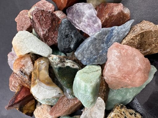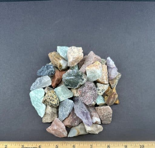 This is a mixture of different stones for the rock tumbler or other decorative use. This is a smaller size from 1/2″ to 1″. It would be a nice size for a small tumbler or if you want to tumble polish a batch of smaller stones in any tumbler. This mixture may consist of Rose Quartz, Green Aventurine, Lace Agate, White Quartz, different types of Jasper, Pudding Stone, Moss Agate, Sodalite, India Tree Agate, Petrified Wood, Turritella Agate, Prairie Agate and others.