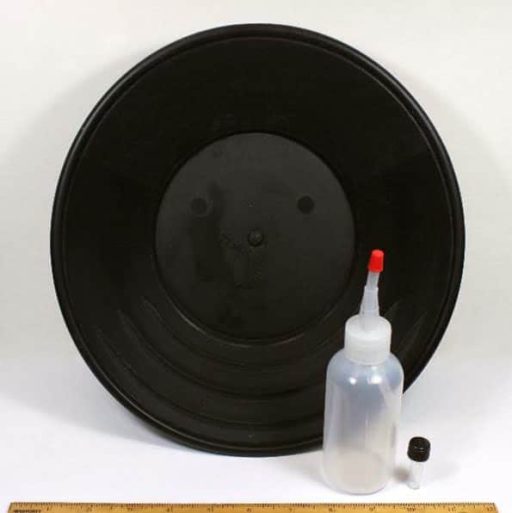 EQ206 Here is a Gold Pan Starter Set that compliments any of the Gold Pan Kits listed. The Starter Set includes 10 3/4″ black plastic Gold Pan, 1 clear plastic 2 oz. Snuffer bottle; and 1 small clear, collection bottle with cap to keep the Gold found during panning. The pan is lightweight and easy to use for all ages.