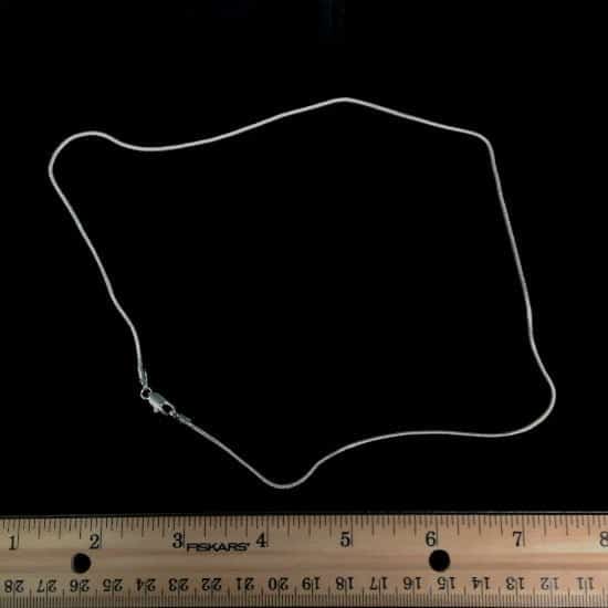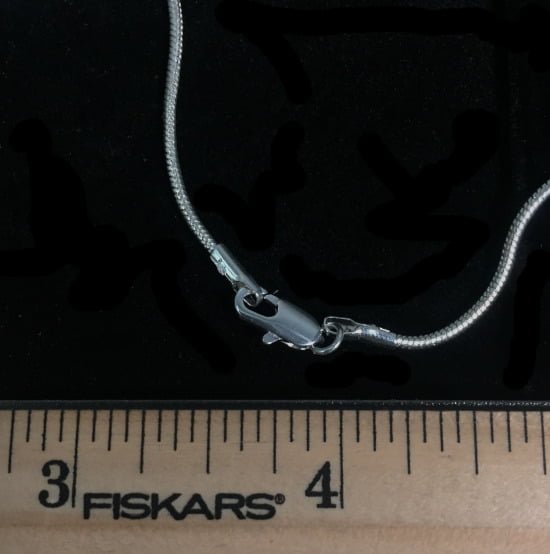 Silver Color Chain – 1 mm and 18″ in length with a clasp. All it needs is to attach a bell capped or wire tied stone, or other decoration for a ready to wear necklace.