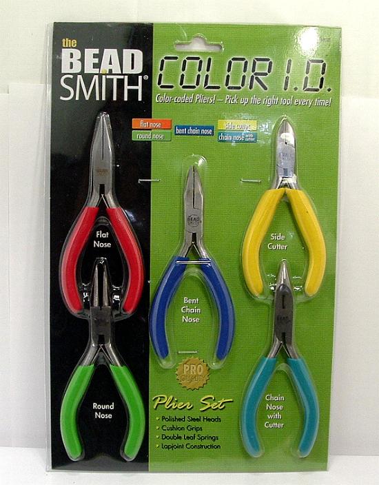 1WR5 This is a set of five piece pliers set by Bead Smith. They include flat nose, chain nose, round nose, bent chain nose pliers and side cutters. Use them for gripping or bending wire, making repairs, or doing tight precision work. Lapjoint construction, polished steel heads, double leaf springs and cushion grips. They are color coded to identify the correct tool every time.