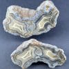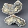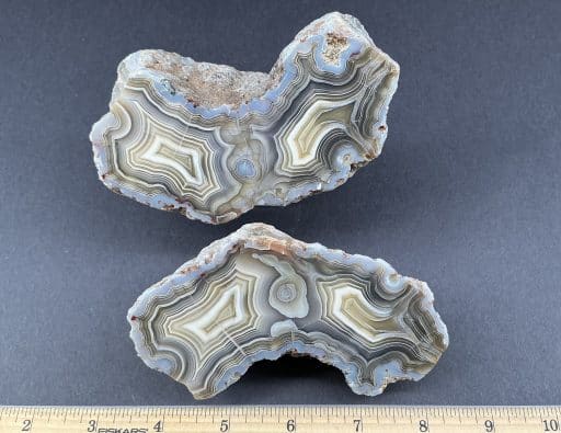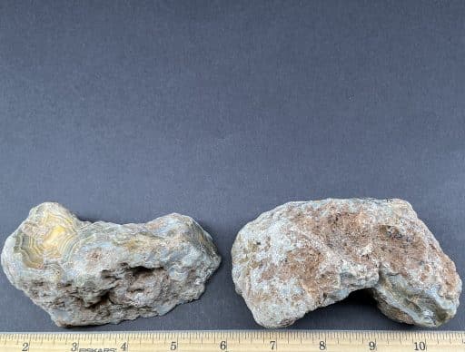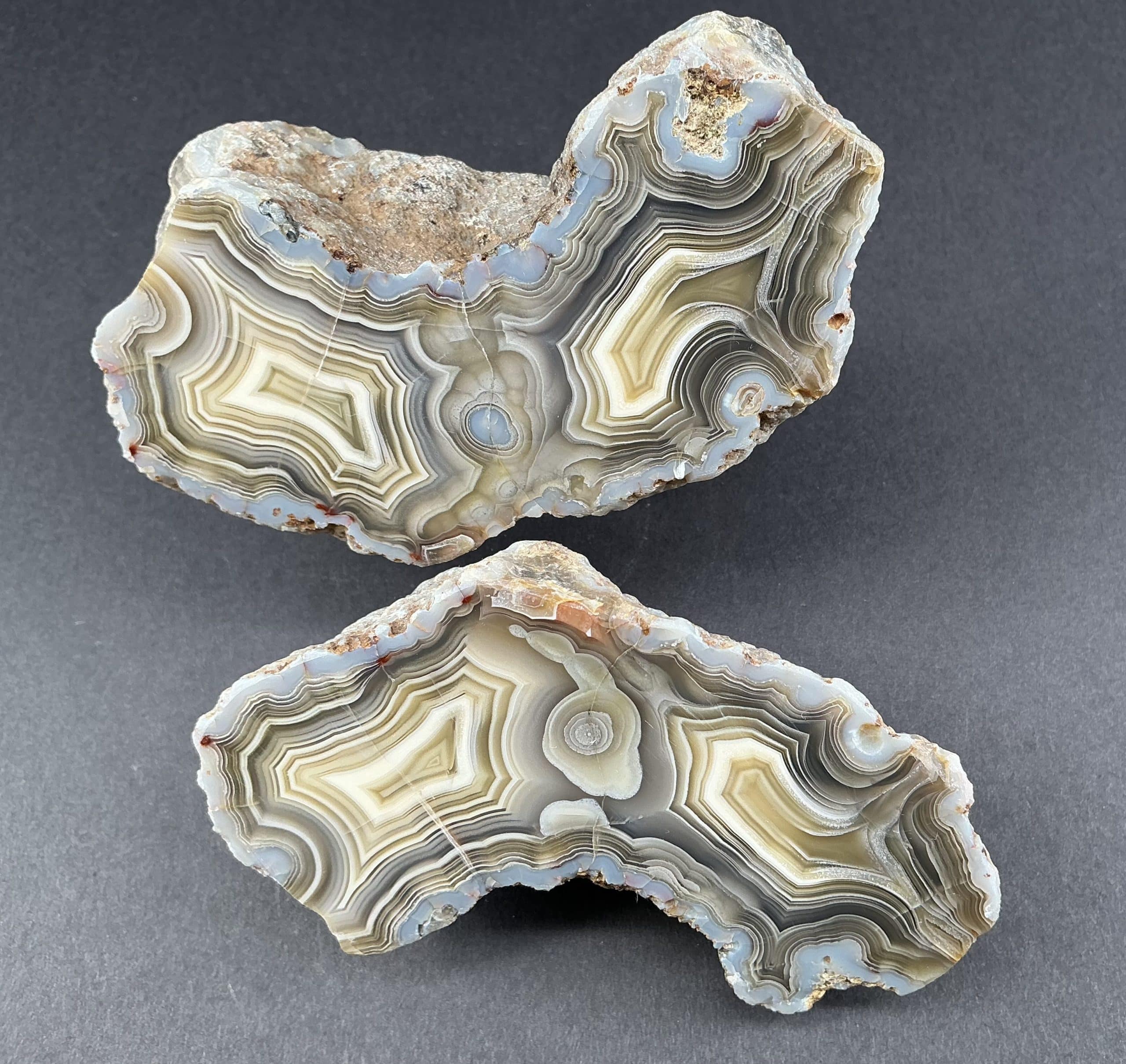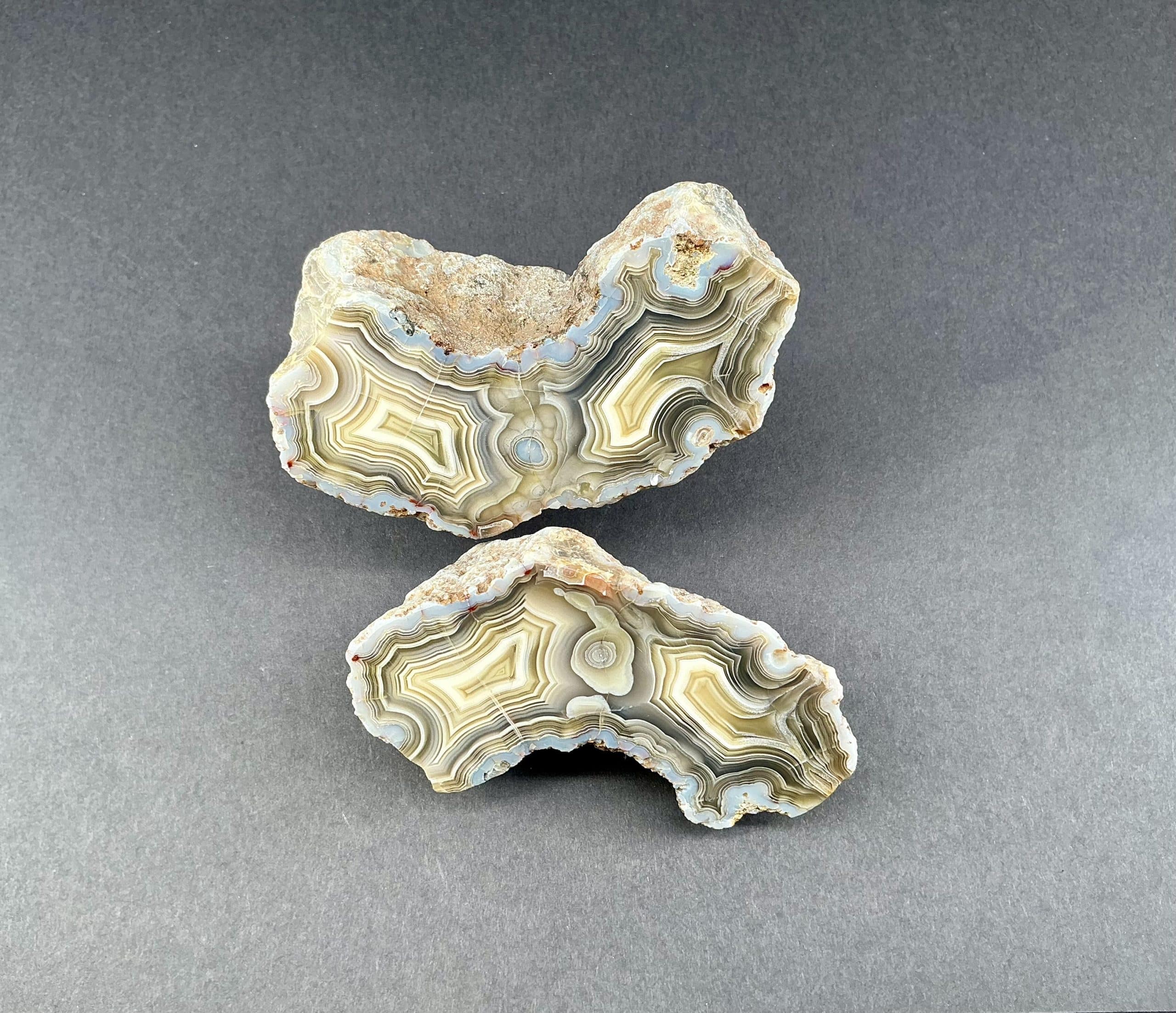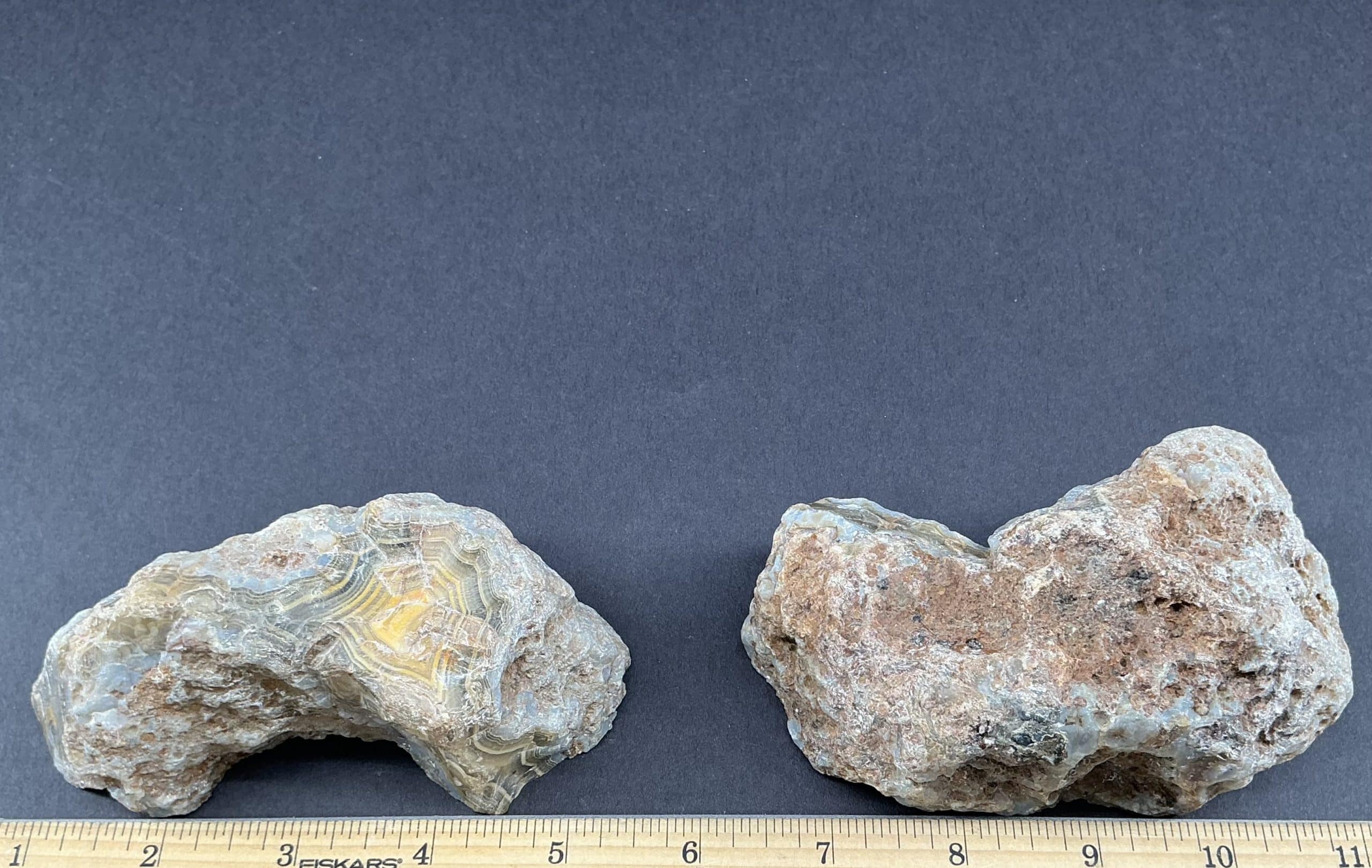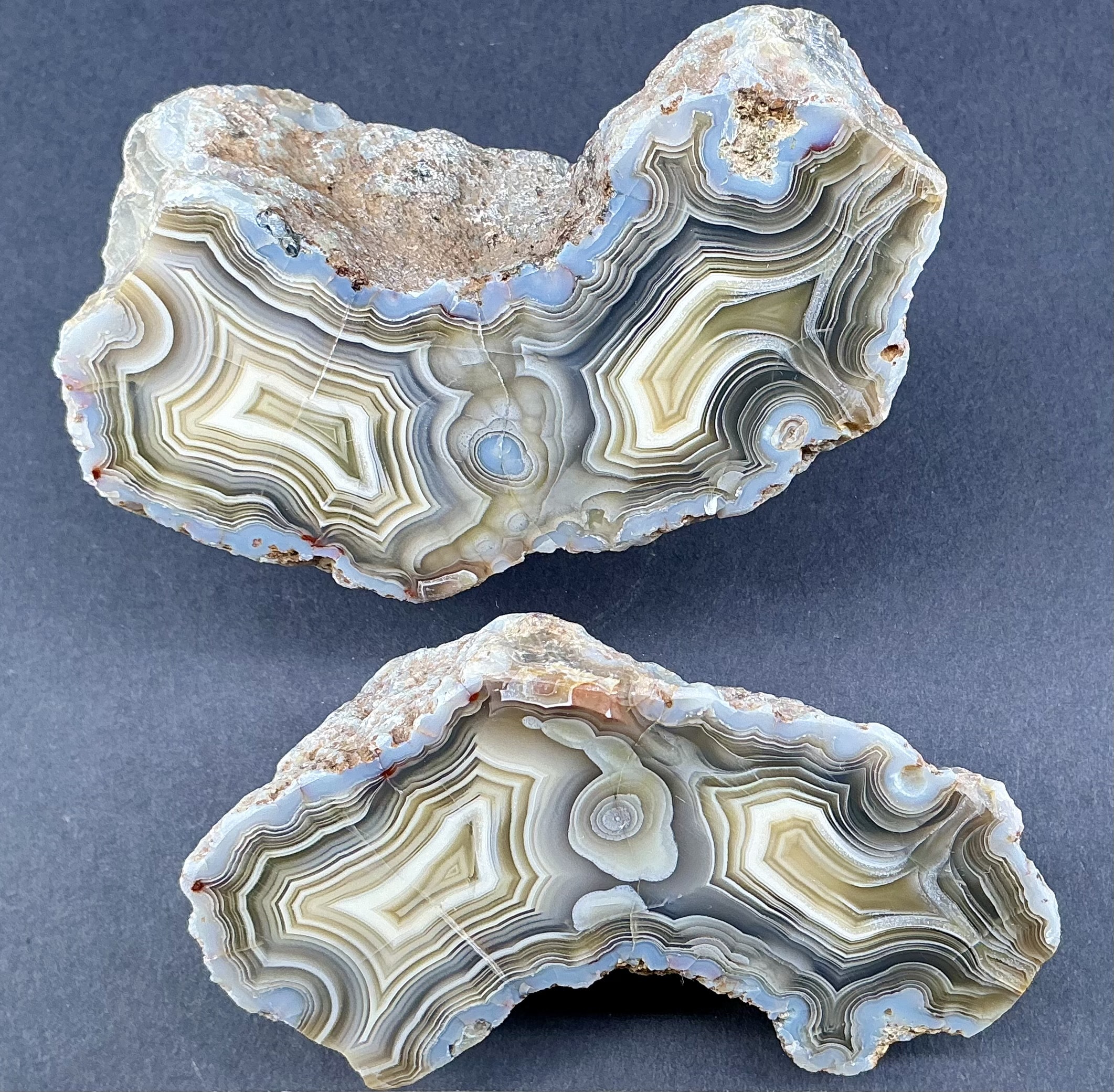 ++Agates mostly occur as nodules in volcanic rocks or waters containing Silica in solution which is possibly derived from the decomposition of Silicates in the lava. The Siliceous matter is deposited in regular layers resulting in the banded or striped formation. It is very unlikely that you would ever find an exact duplicate of any type of Agate, Fairburn or other.