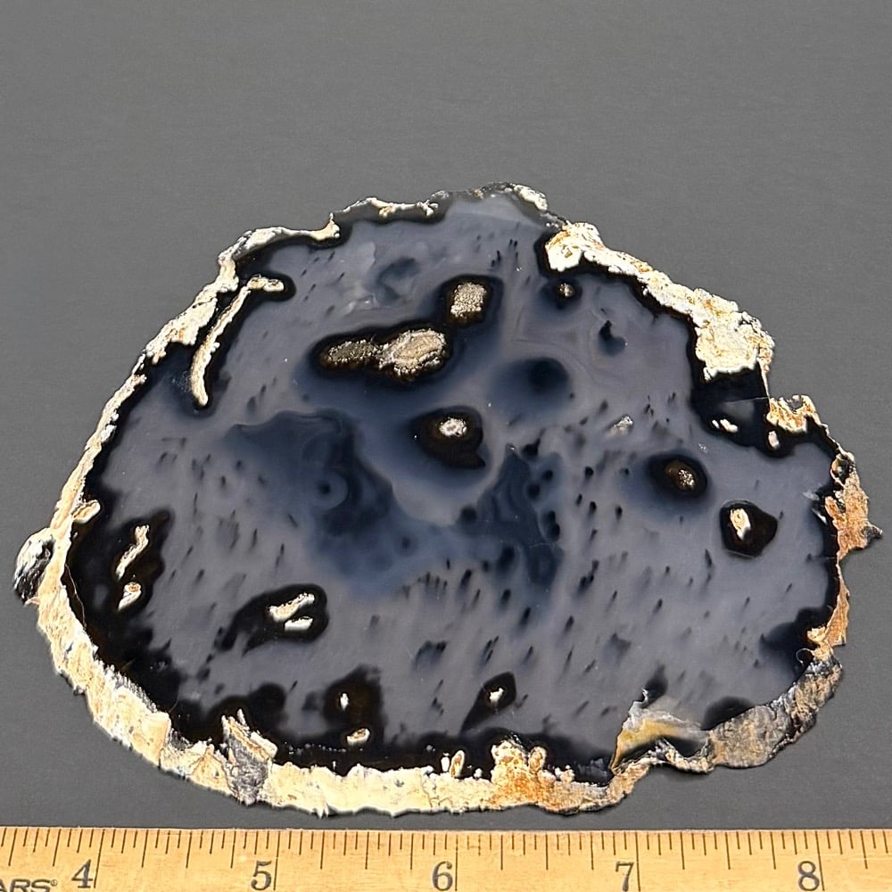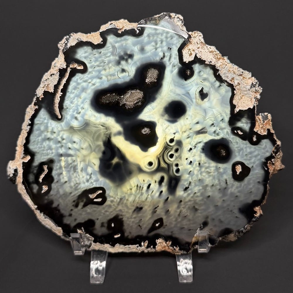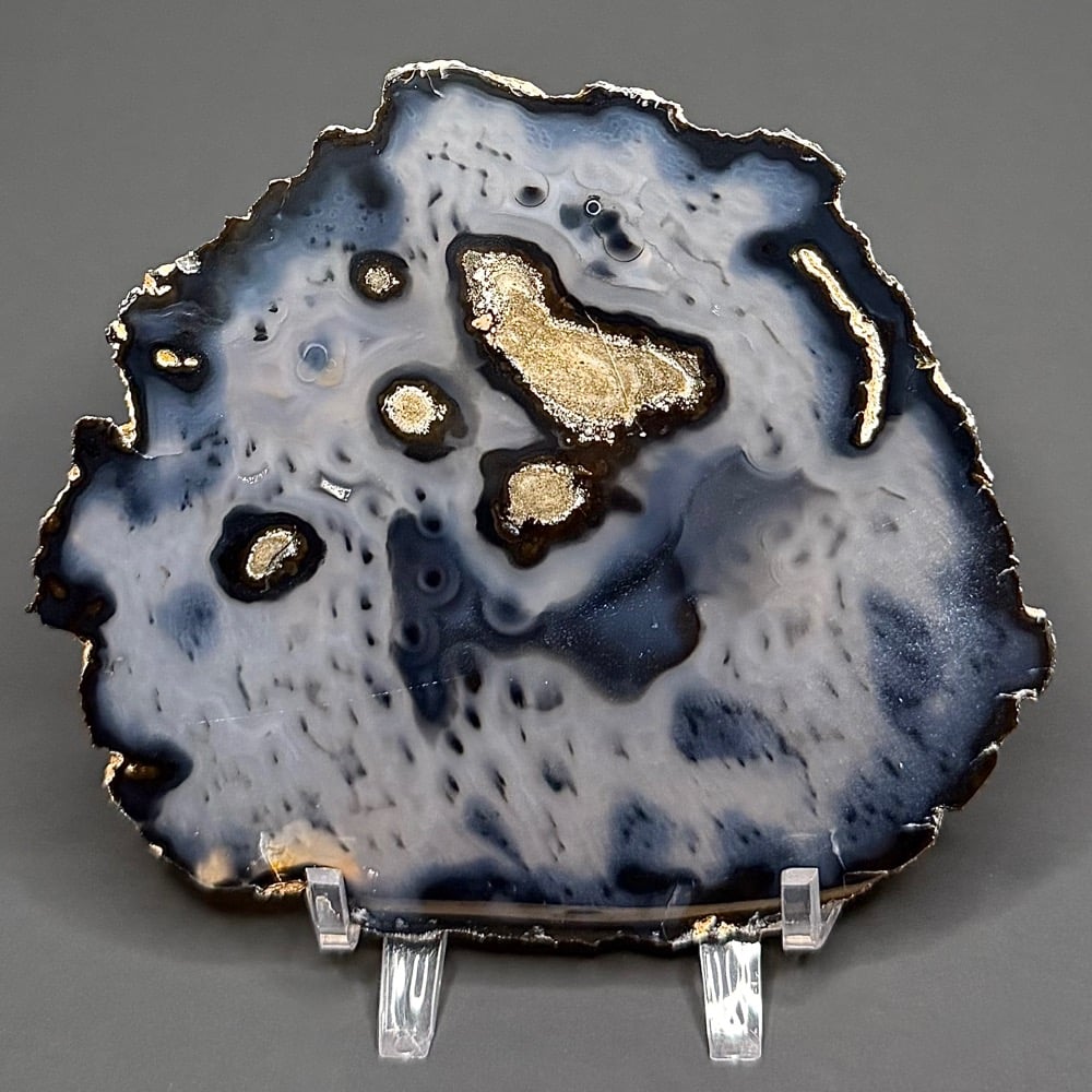 Agates mostly occur as nodules in volcanic rocks or waters containing silica in solution possibly derived from the decomposition of silicates in the lava.  The siliceous matter is deposited in regular layers resulting in the banded or striped formation.