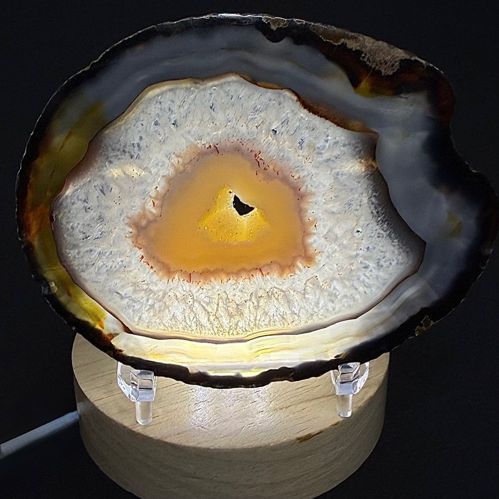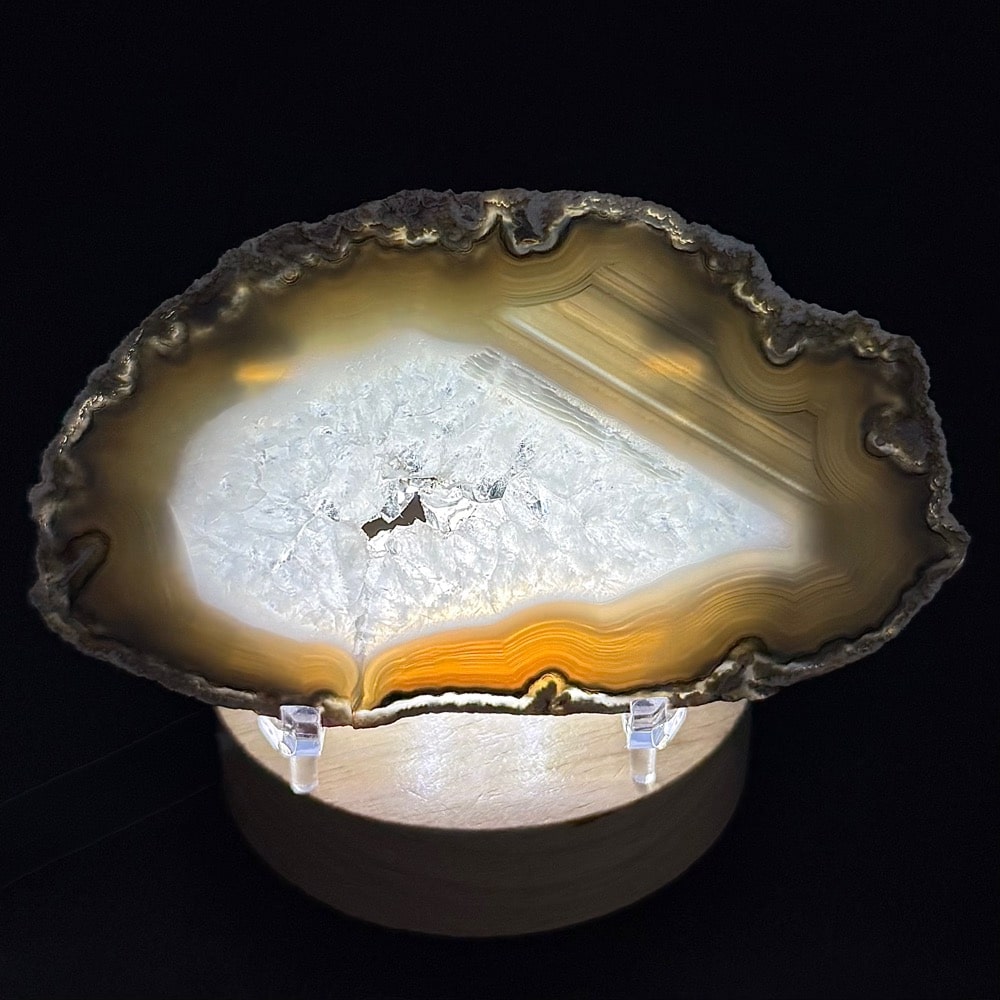 Appearance: High, glossy polish enhances the gorgeous banding, surprising crystal cavities. Earthtone colors.