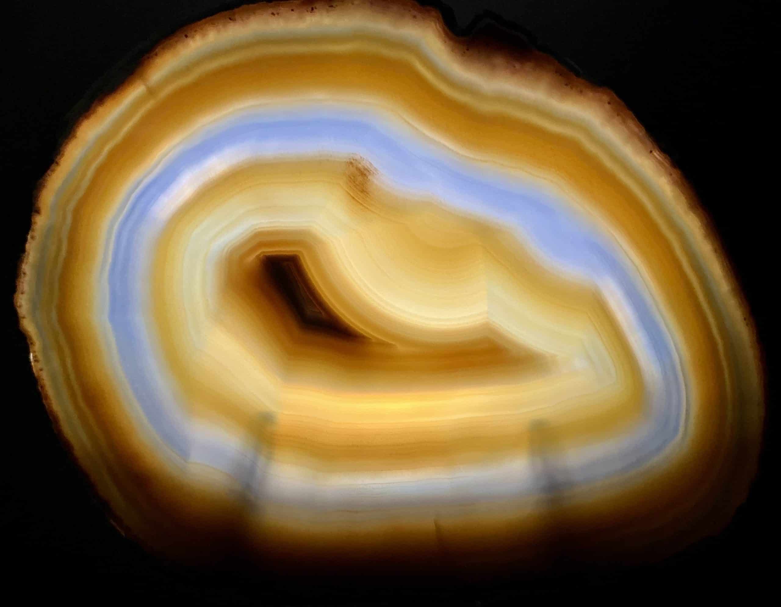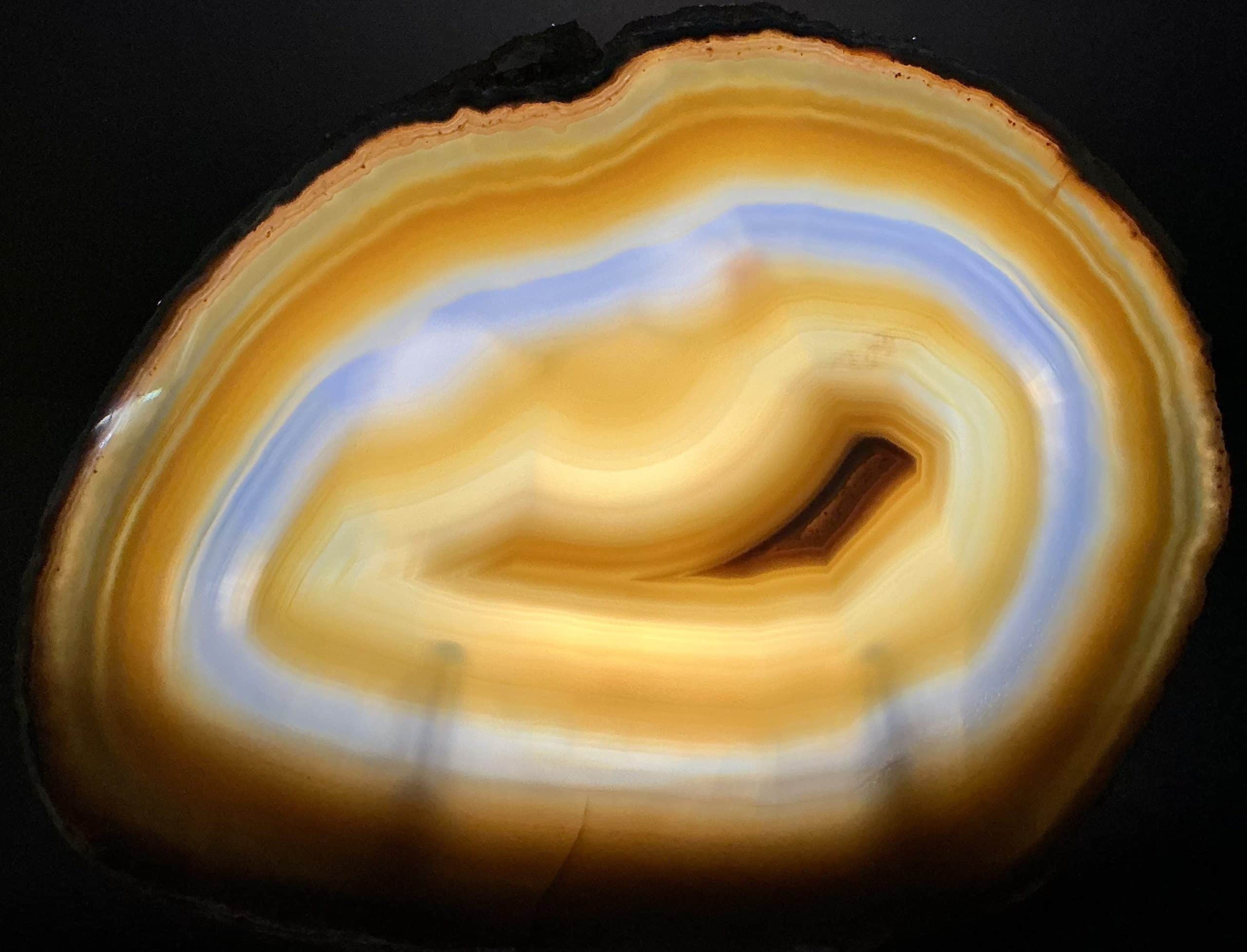 Agates mostly occur as nodules in volcanic rocks or waters containing silica in solution possibly derived from the decomposition of silicates in the lava.  The siliceous matter is deposited in regular layers resulting in the banded or striped formation.