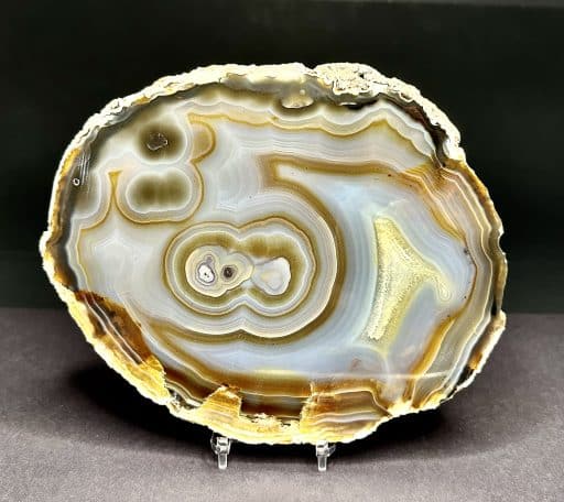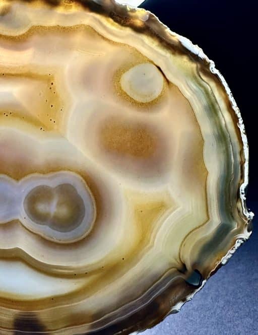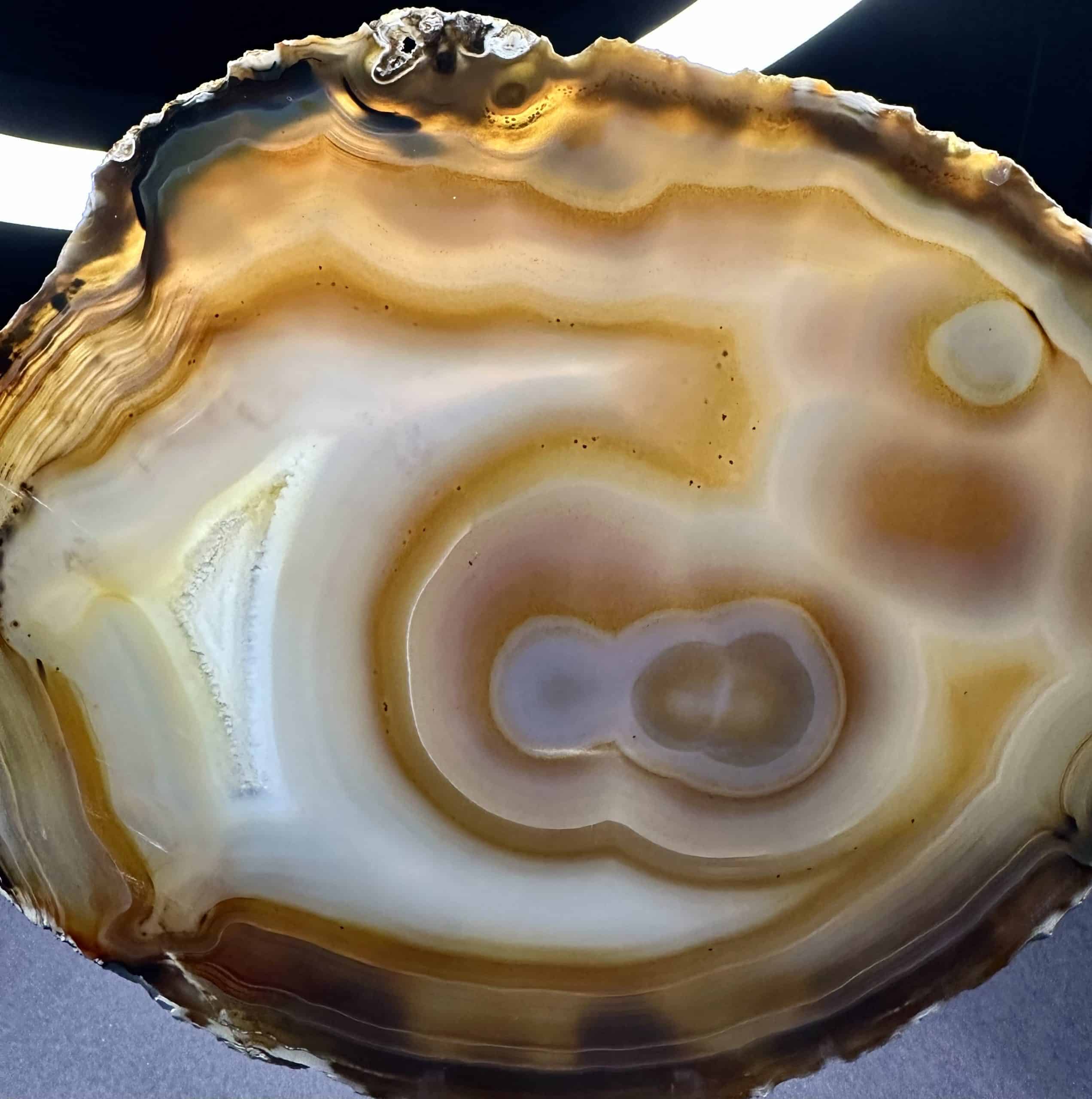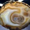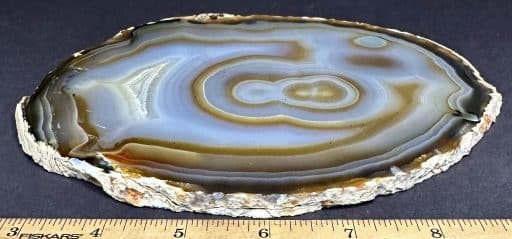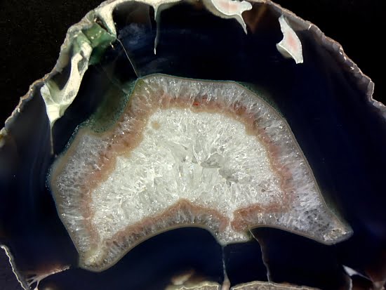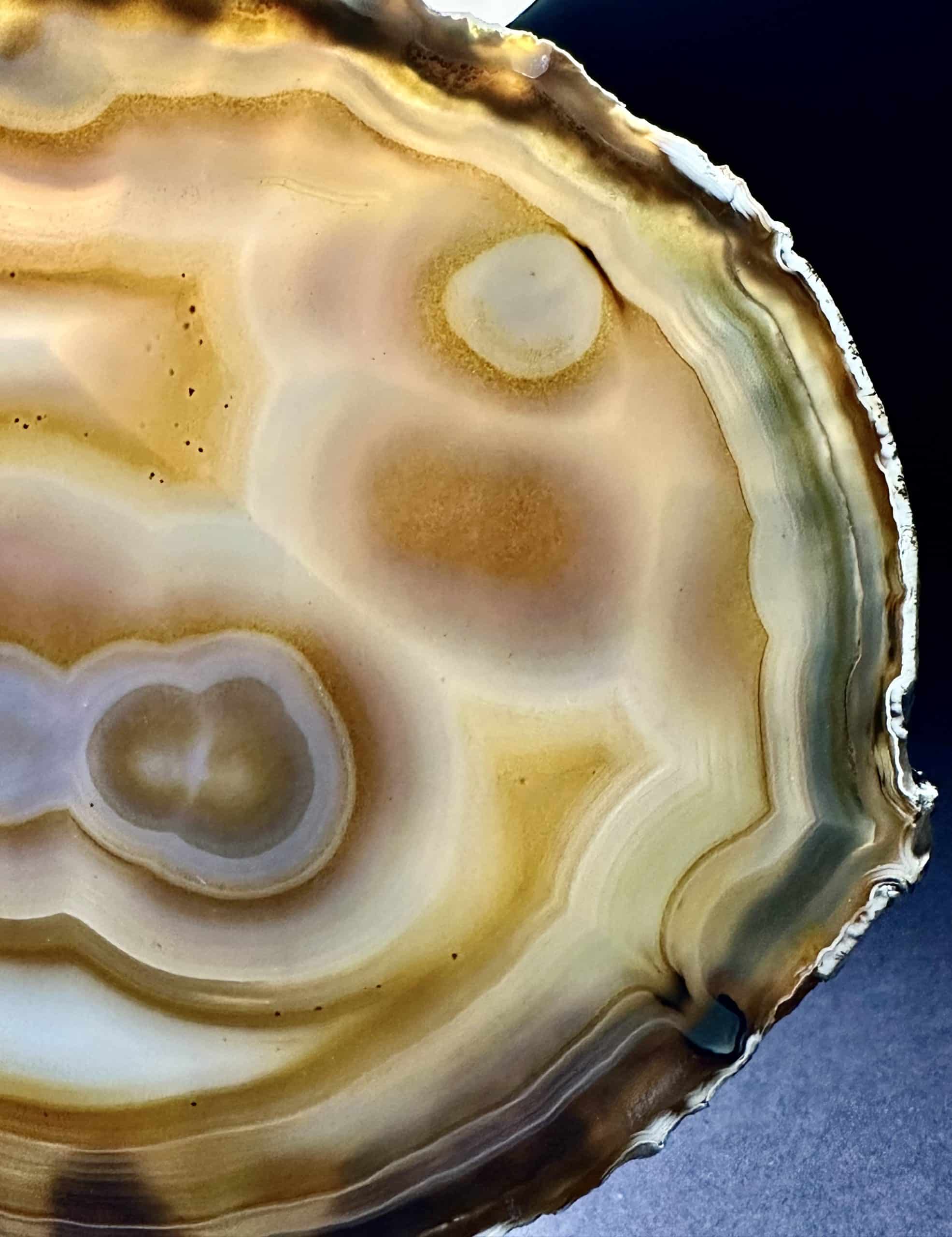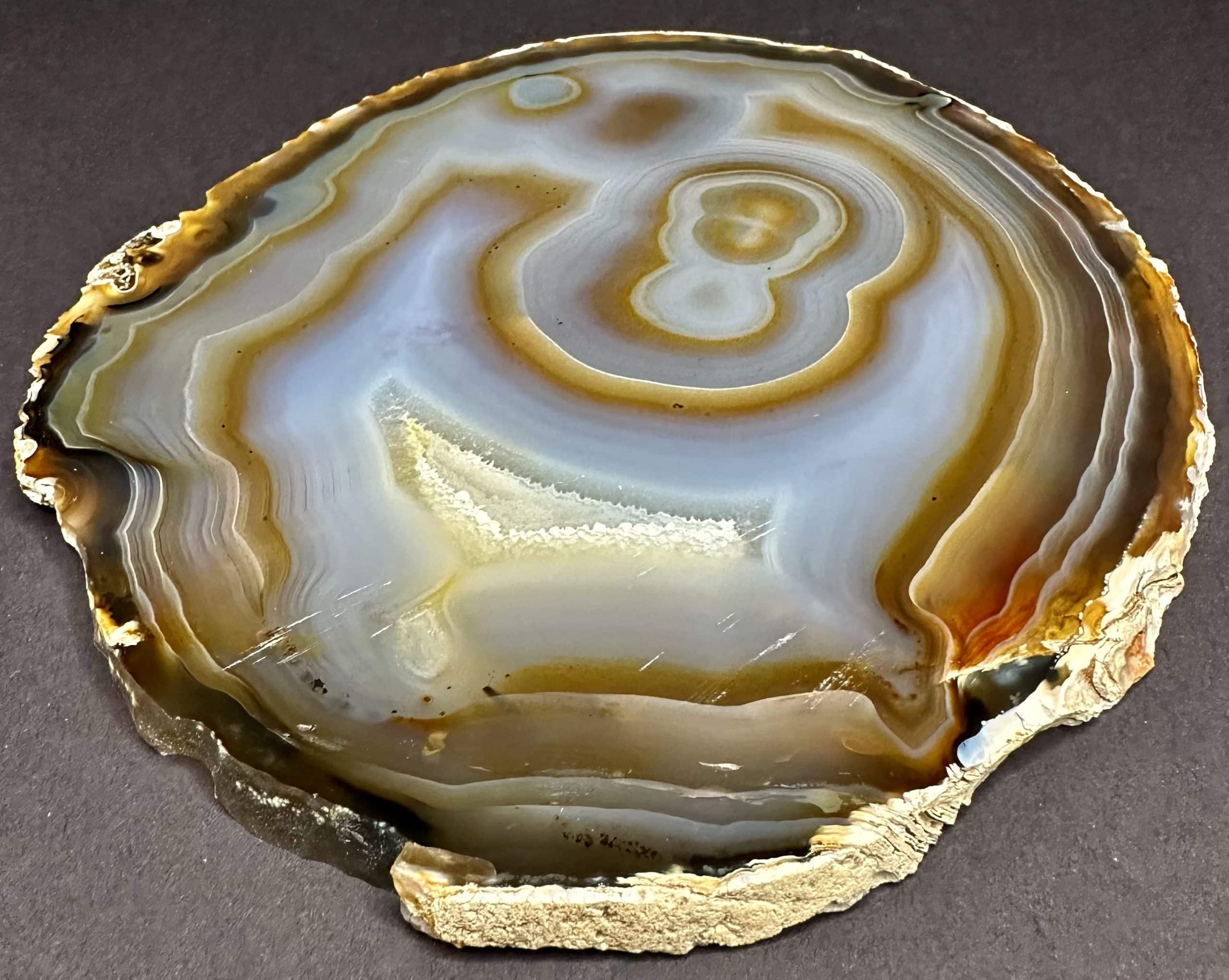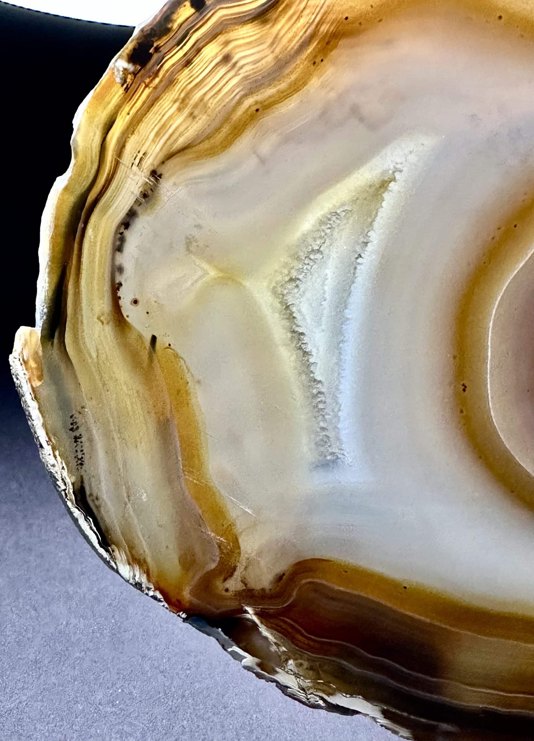 Agates mostly occur as nodules in volcanic rocks or waters containing silica in solution possibly derived from the decomposition of silicates in the lava.  The siliceous matter is deposited in regular layers resulting in the banded or striped formation.
